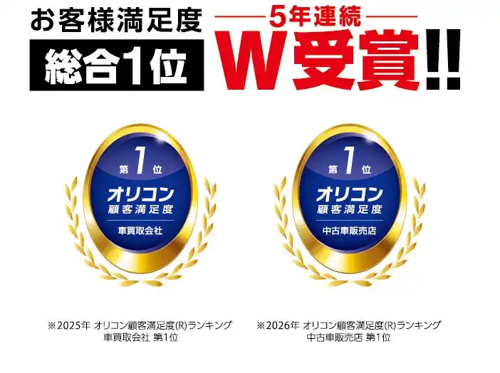 これにより、昨年10月にリリースいたしました、2025年 オリコン顧客満足度調査「車買取会社」での総合1位選出と合わせて、5年連続での2冠達成となりました。 |