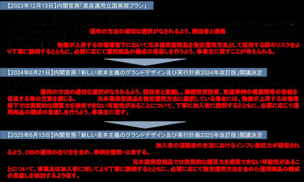 また、DBについては、将来の給付水準が相対的に低下しないよう、加入者の退職後の生活におけるインフレ抵抗力が確保されるような給付改善等の検討が求められます |