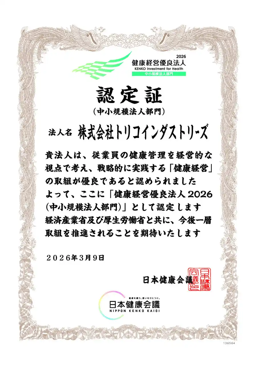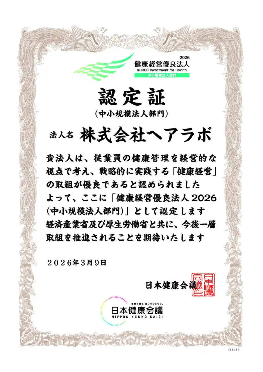 理美容ディーラーの株式会社ヘアラボ(本社:大阪市浪速区、代表取締役社長:村島有治)は2026年3月、経済産業省と日本健康会議が共同で実施する「健康経営優良法人2026(中小規模法人部門)」に認定されましたので、お知らせいたします。また、グループ会社、理美容メーカーの株式会社トリコインダストリーズも「健康経営優良法人2026(中小規模法人部門)」に同時認定されました。両社ともに2年連続の認定となります。