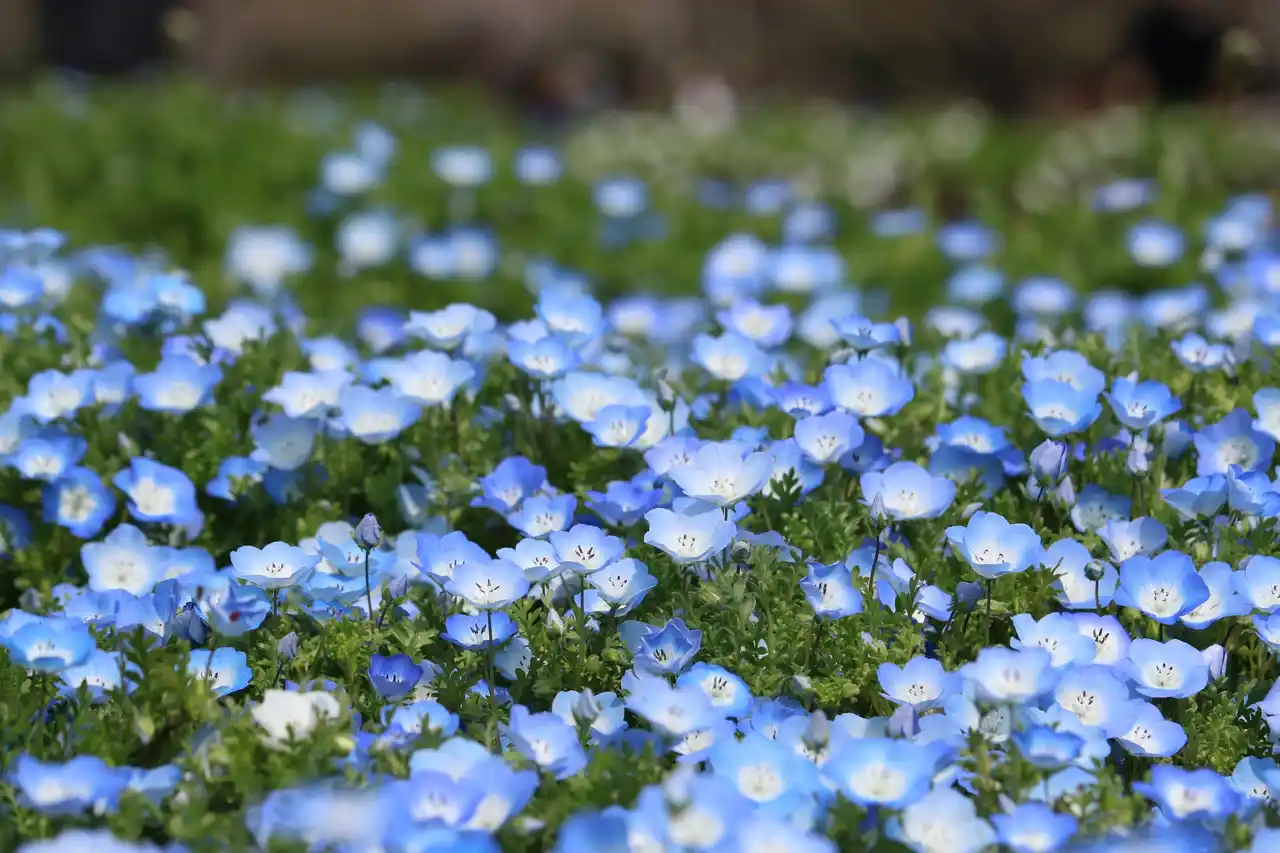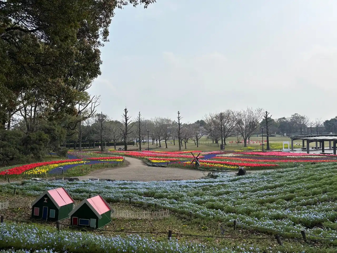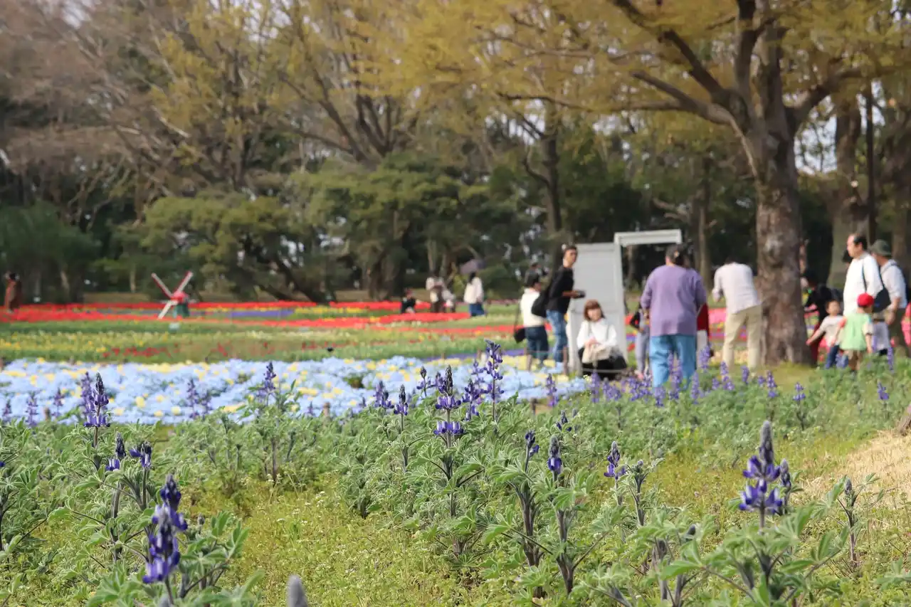 | 木曽三川の雄大な流れを連想させる、色鮮やかなチューリップの中に青いムスカリで川の流れを描いた大花壇が見所です。その他、変わり咲き品種のチューリップや、サクラ、ネモフィラなど、カラフルな春の花々が公園を彩ります。 | ||||||||||||||