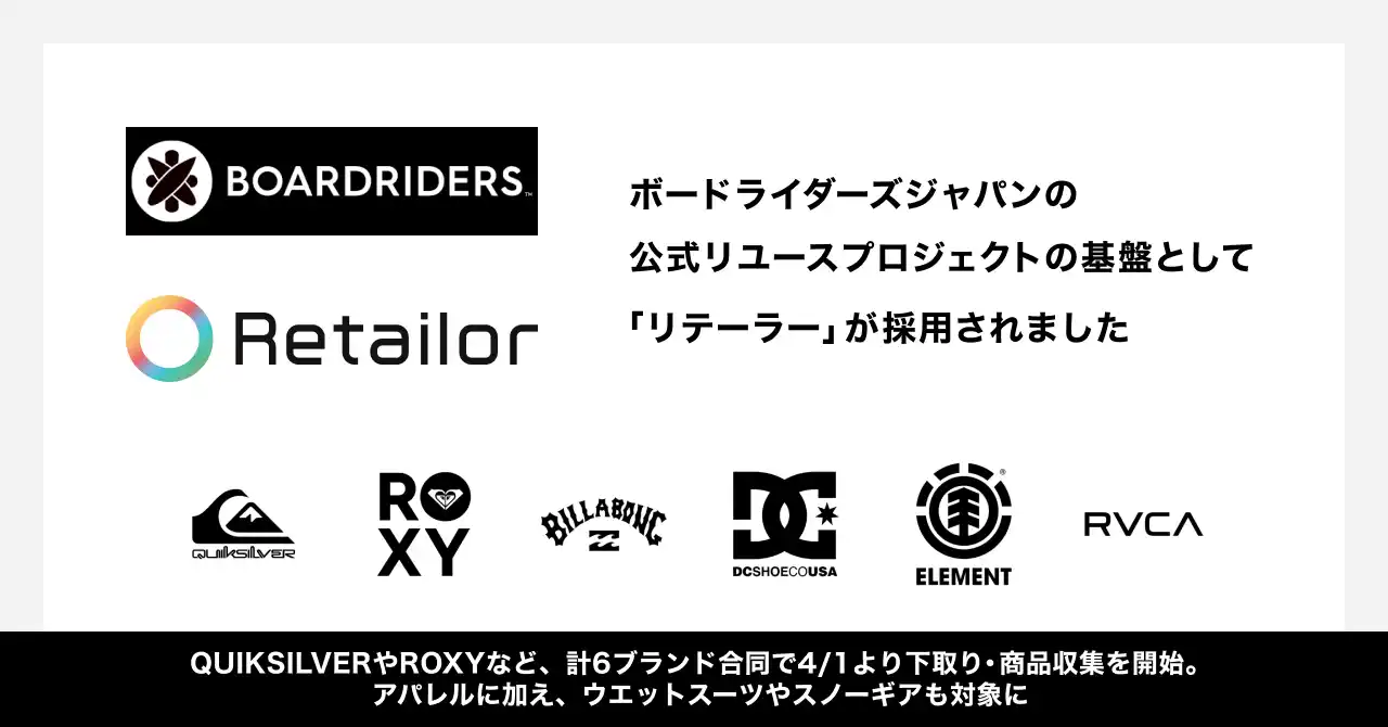 Free Standard株式会社(本社:東京都渋谷区、代表取締役社長:張本貴雄)が提供するリコマースオペレーティングシステム「Retailor(リテーラー)」が、ボードライダーズジャパン合同会社(本社:東京都渋谷区)が展開するアクションスポーツブランドの公式リユースプロジェクトの基盤として採用されたことをお知らせいたします。 |