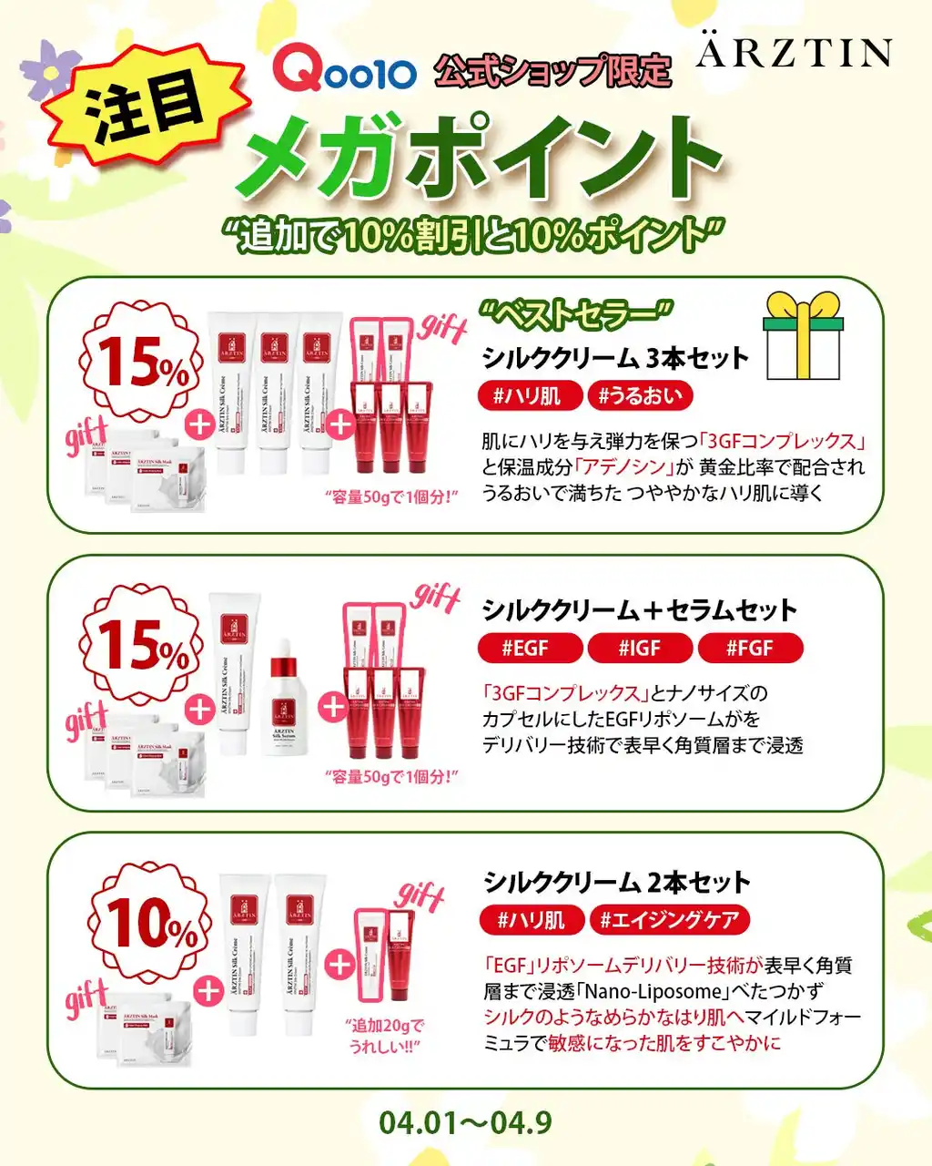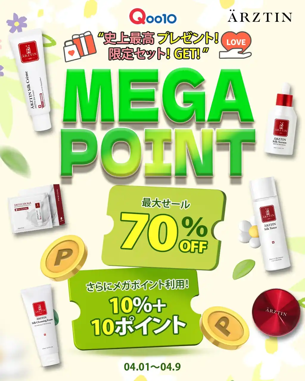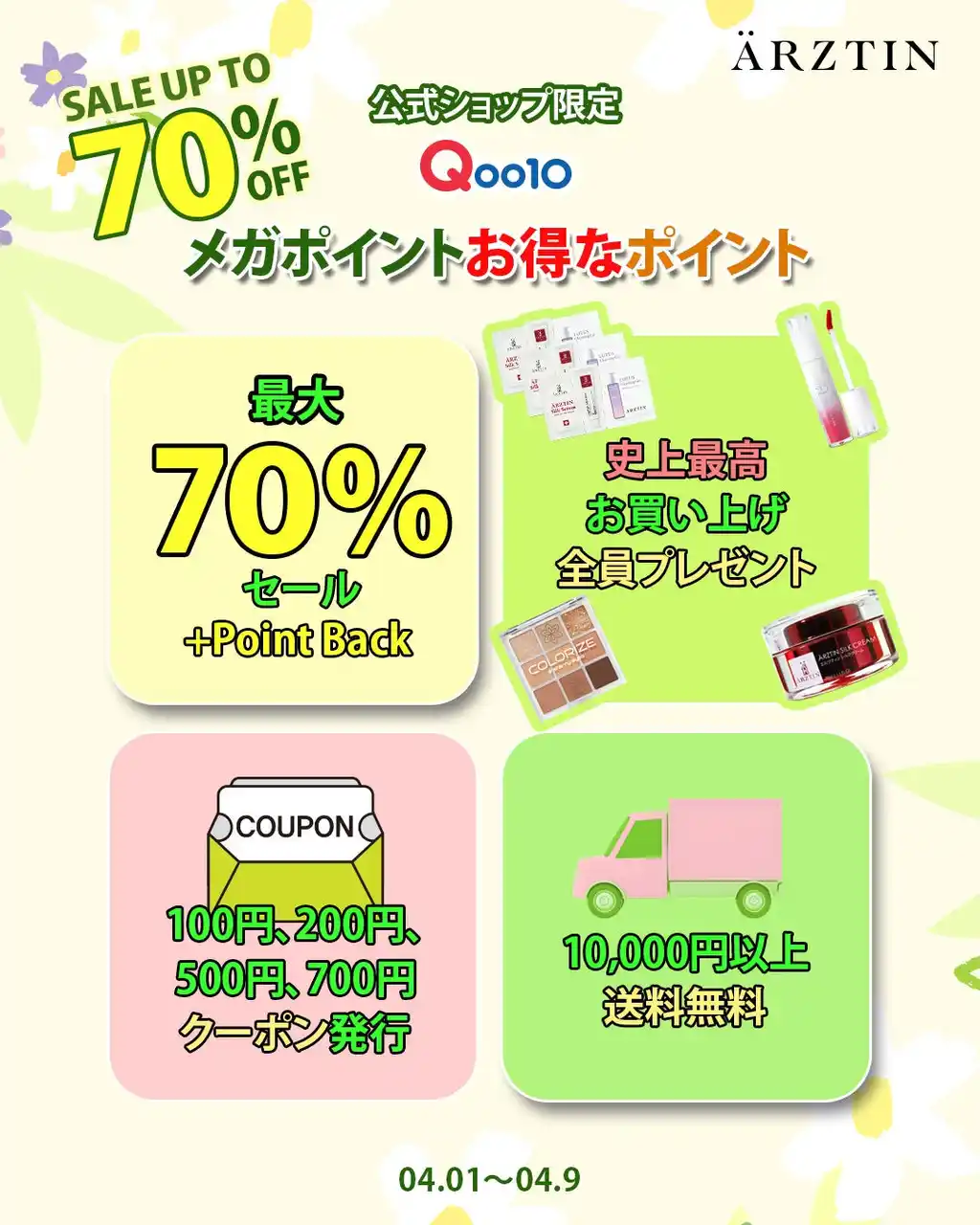 今回のエルツティンQoo10公式ショップのメガポイントでは、最大70%OFFとお買い上げの方全員にはARZTINサンプル3種1個セットを3個(合計9個)をプレゼントとS2NDの「ニュープラネットティント(色はランダム) 1個」1,430円相当 、5,000円以上は「カラーライズスターリーアイズ(色はランダム) 1個」2,970円相当 、10,000円以上は「シルククレンジングフォーム(150ML)3,190円相当1個」をプレゼント。 以前よりお得なクーポンも700円クーポン、500円クーポン、200円クーポン、100円クーポン様々なクーポンを発行して10,000円以上は送料が無料のチャンスがありますのでぜひ、楽しんで下さい。 |