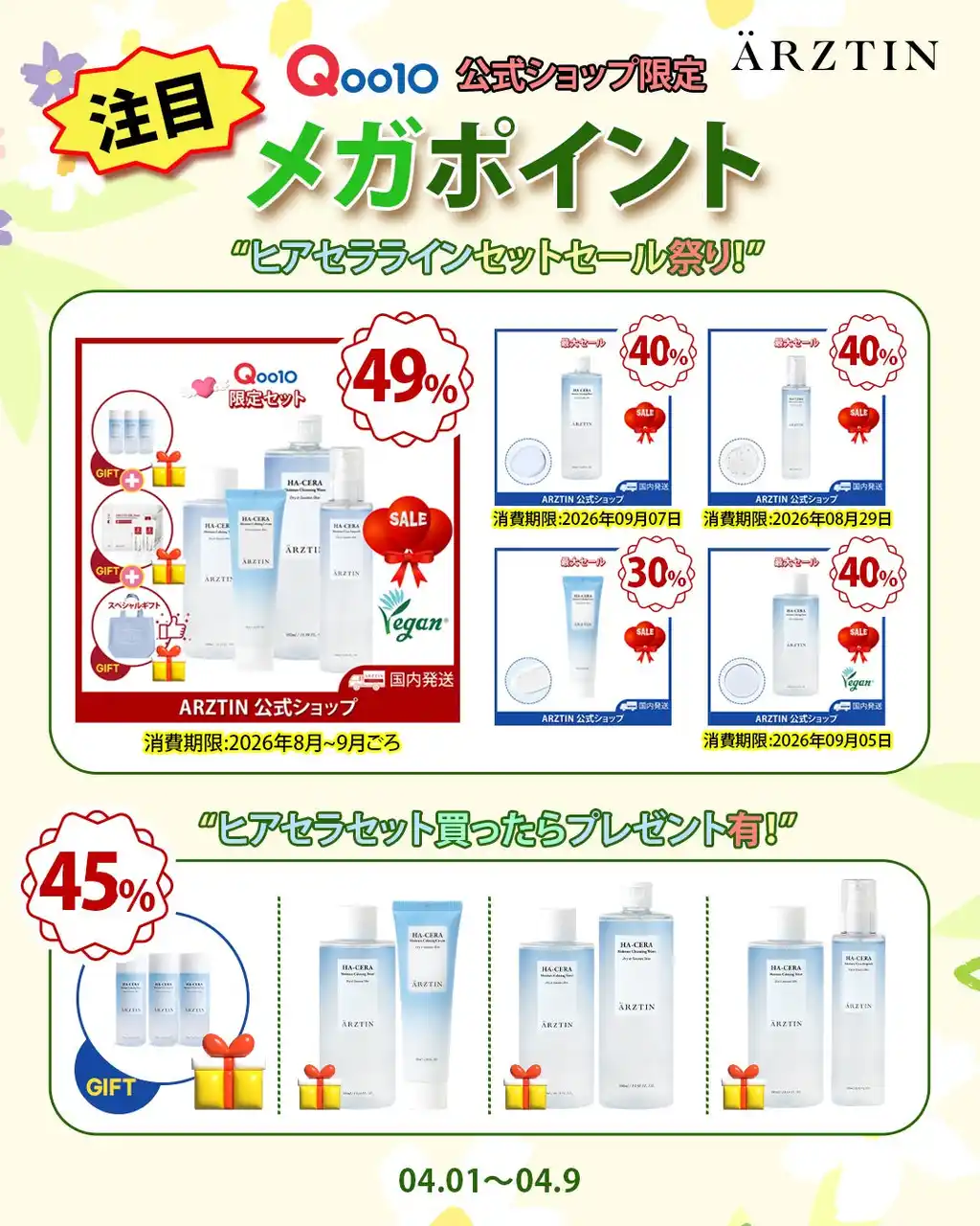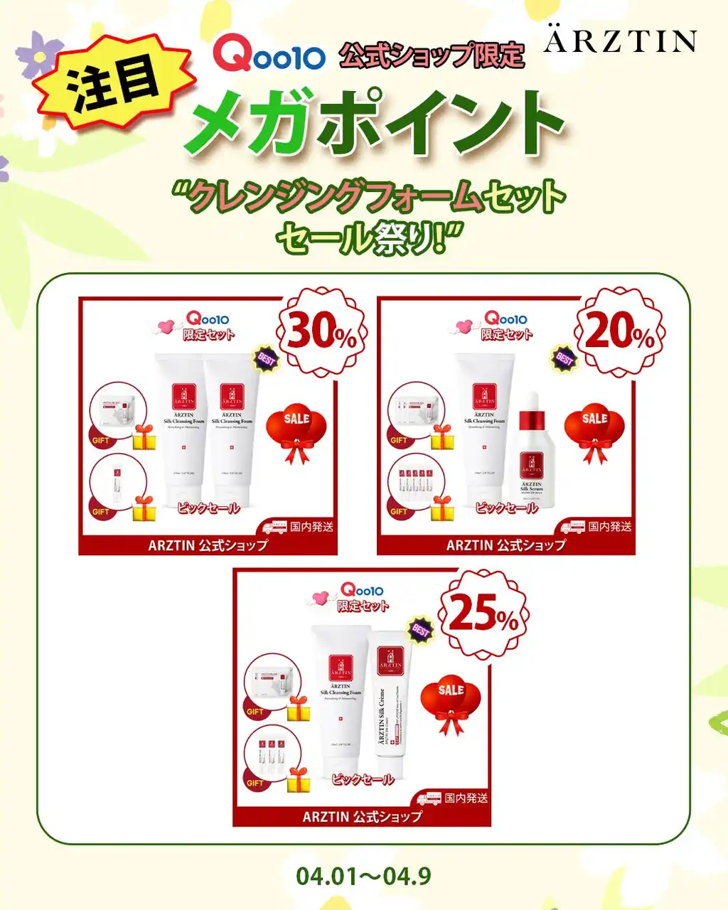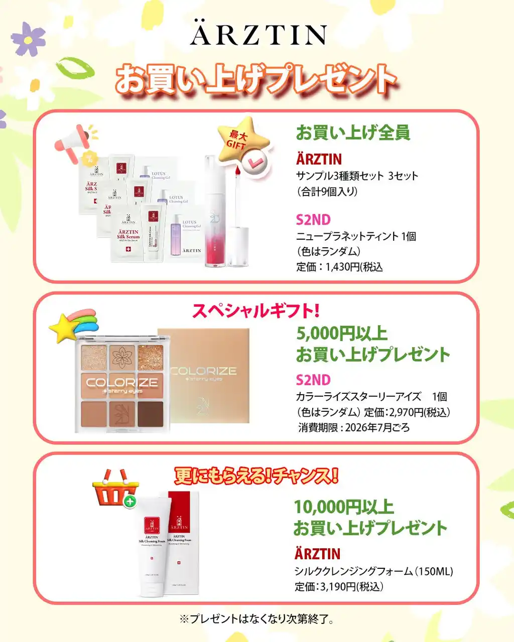 今回のエルツティンQoo10公式ショップのメガポイントでは、最大70%OFFとお買い上げの方全員にはARZTINサンプル3種1個セットを3個(合計9個)をプレゼントとS2NDの「ニュープラネットティント(色はランダム) 1個」1,430円相当 、5,000円以上は「カラーライズスターリーアイズ(色はランダム) 1個」2,970円相当 、10,000円以上は「シルククレンジングフォーム(150ML)3,190円相当1個」をプレゼント。 以前よりお得なクーポンも700円クーポン、500円クーポン、200円クーポン、100円クーポン様々なクーポンを発行して10,000円以上は送料が無料のチャンスがありますのでぜひ、楽しんで下さい。 |