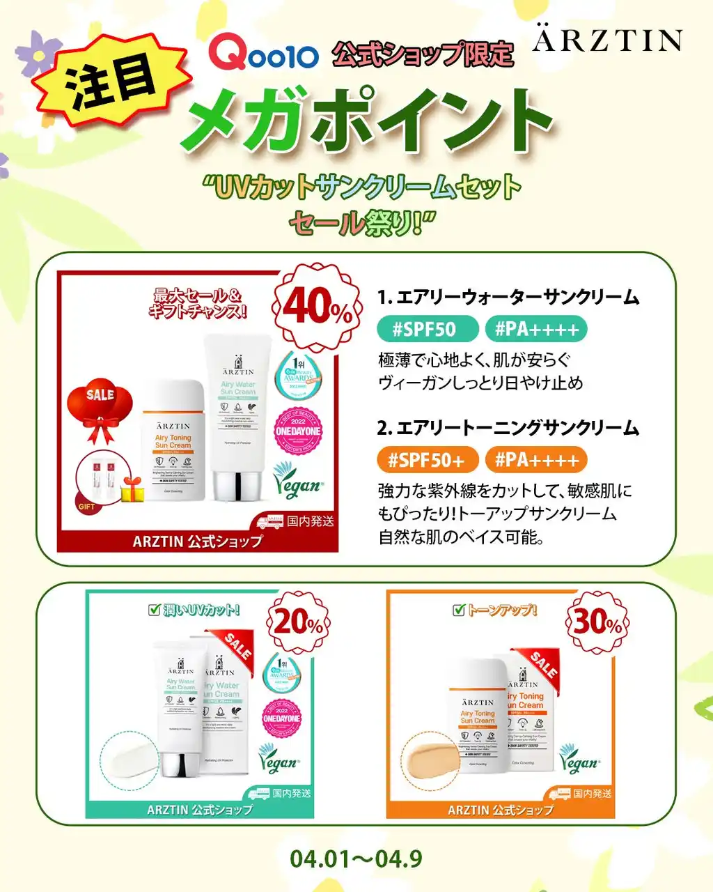 そうして、エルツティンのヴィーガンラインの『エアリーウォーターサンクリーム』20%セール『エアリートーニングサンクリーム』も30%セールでメガポイントに参戦する。2個セット構成は40%セール中でしるくクリーム10g2個付きエルツテインのUVカットはしっとりとしたスキンケアクリームのようなマイルドなつけ心地で優しく使えるUVカットの日やけ止めである。ベビーから大人まで使える優しい日やけ止めで紫外線から肌を守ってマイルドな潤いが肌を保護してくれる。 |