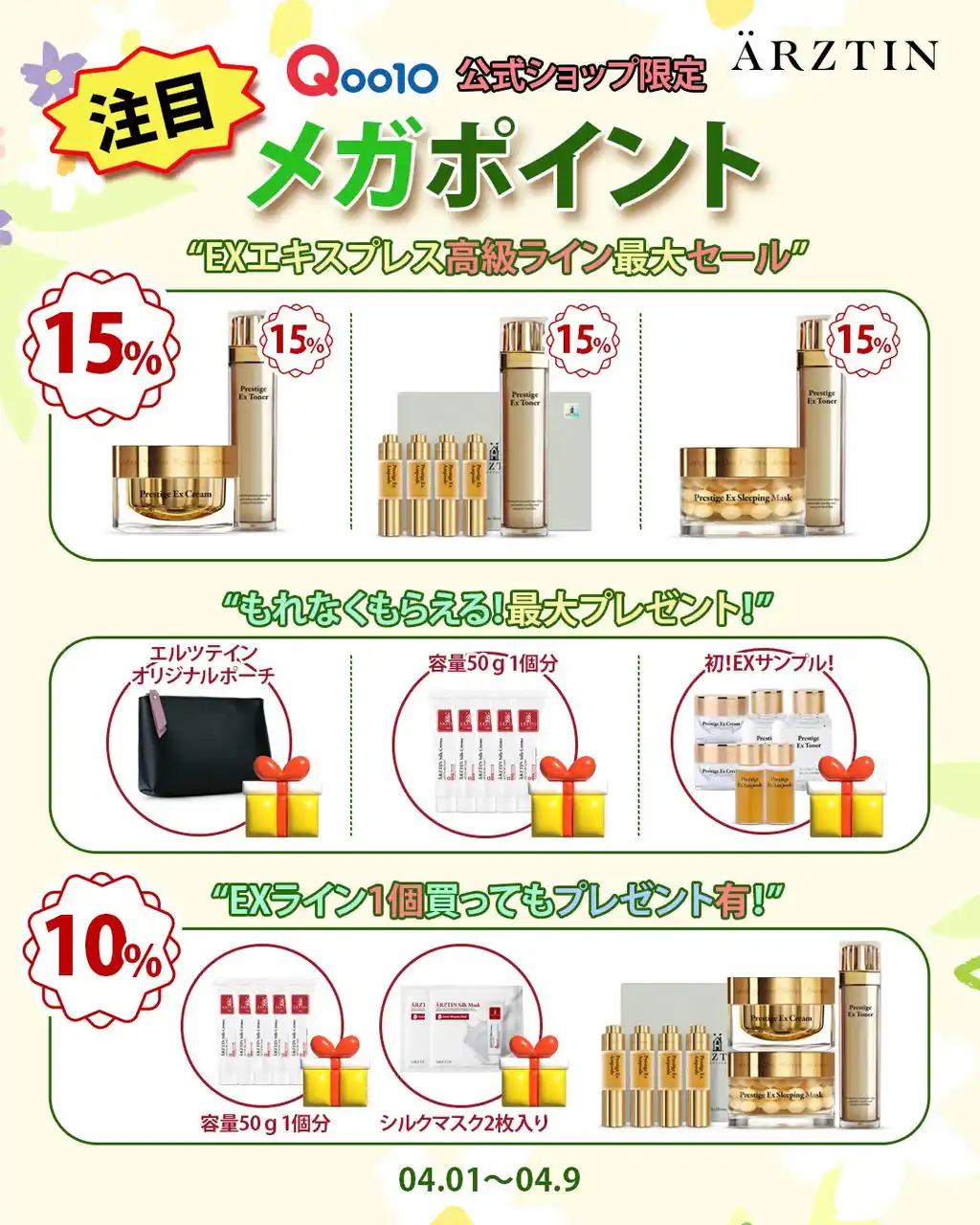 そうして、エルツテインの高級ラインプレステージEXラインもメガポイントに初参戦!お得なセットの企画もあり、シルクラインをより安く買える機会もある。特に今回はシルククレンジングフォームとヒアセララインがビックセール中!よりお得なショッピングが可能。エルツティンメガポイントを楽しんで下さい。詳細はイメージを参考してください。 |