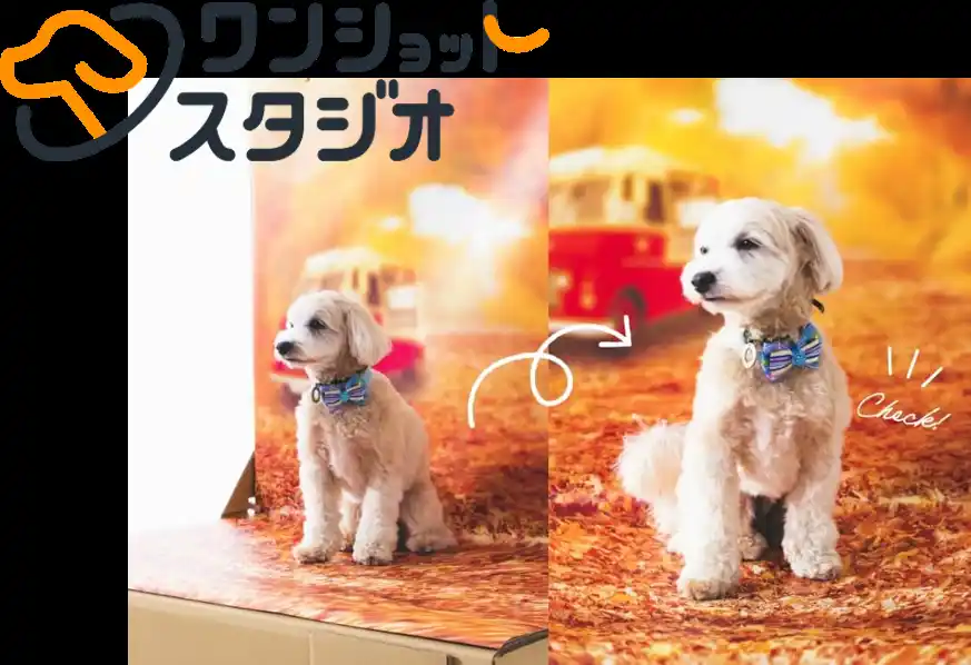 飼い主自身が操作しながら撮れるので、愛犬の自然な表情を引き出すことができ、独自のAIで、ペットの輪郭を切り取り、背景との合成写真が瞬時に出来上がります。 |