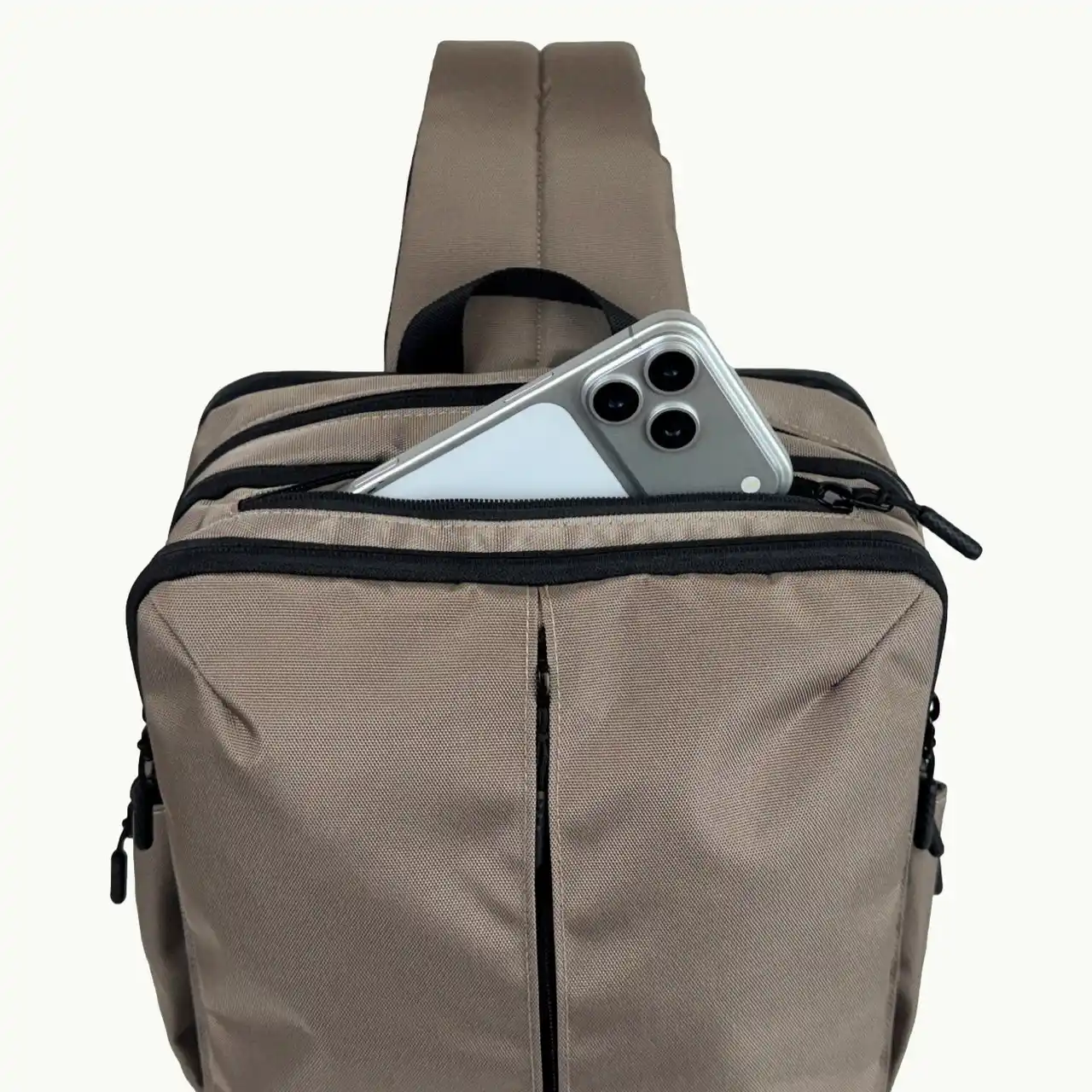 スリングバッグならではの、 背中から前へクルッと回すだけのスムーズな取り出しで、 リュックのようにバッグを下ろす必要がありません。 |