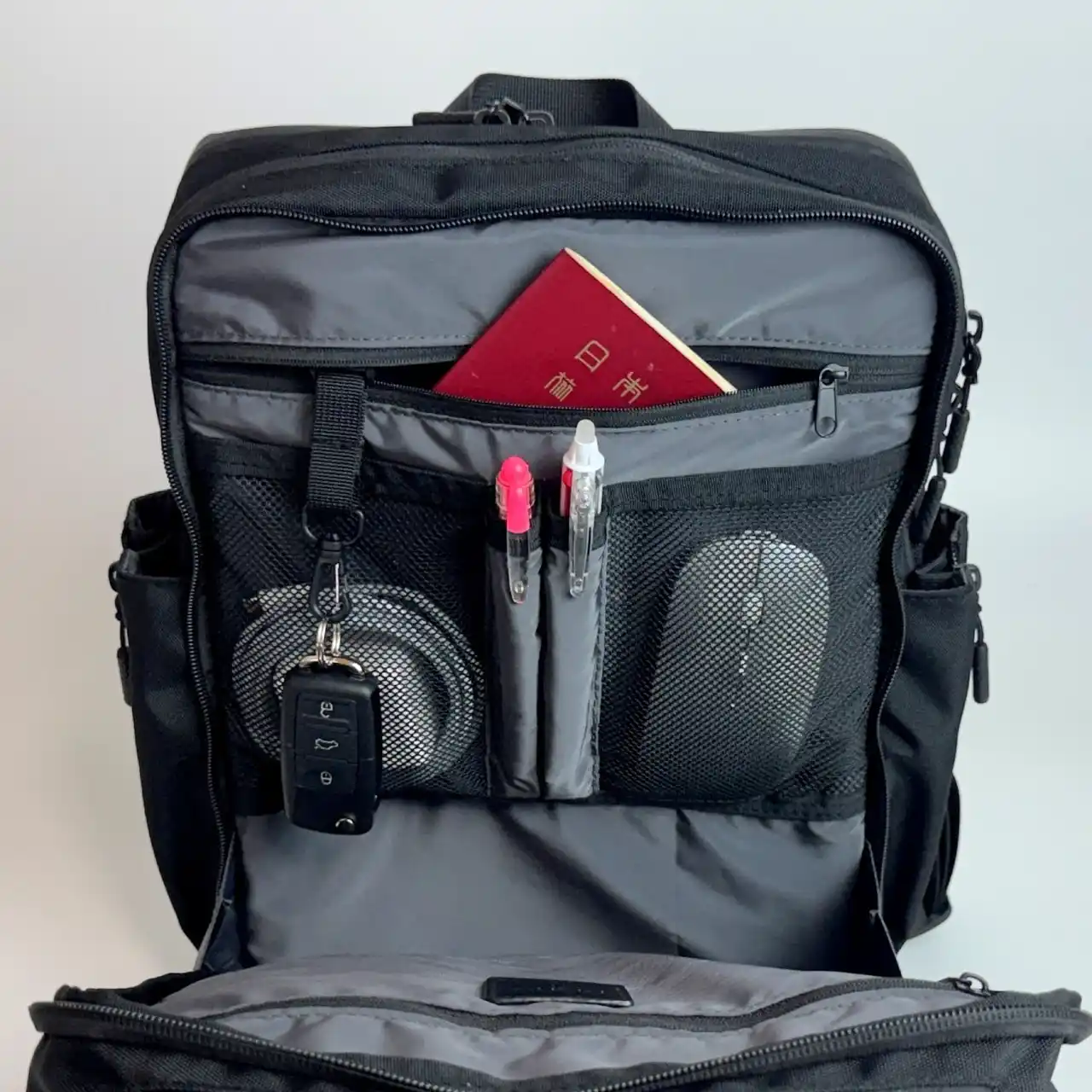 背面側には、大切な物や細かな小物を整理できる収納を配置。 ファスナーポケットのほか、マウスも入るパスポートサイズのメッシュポケット、ペン差しを備えています。 |