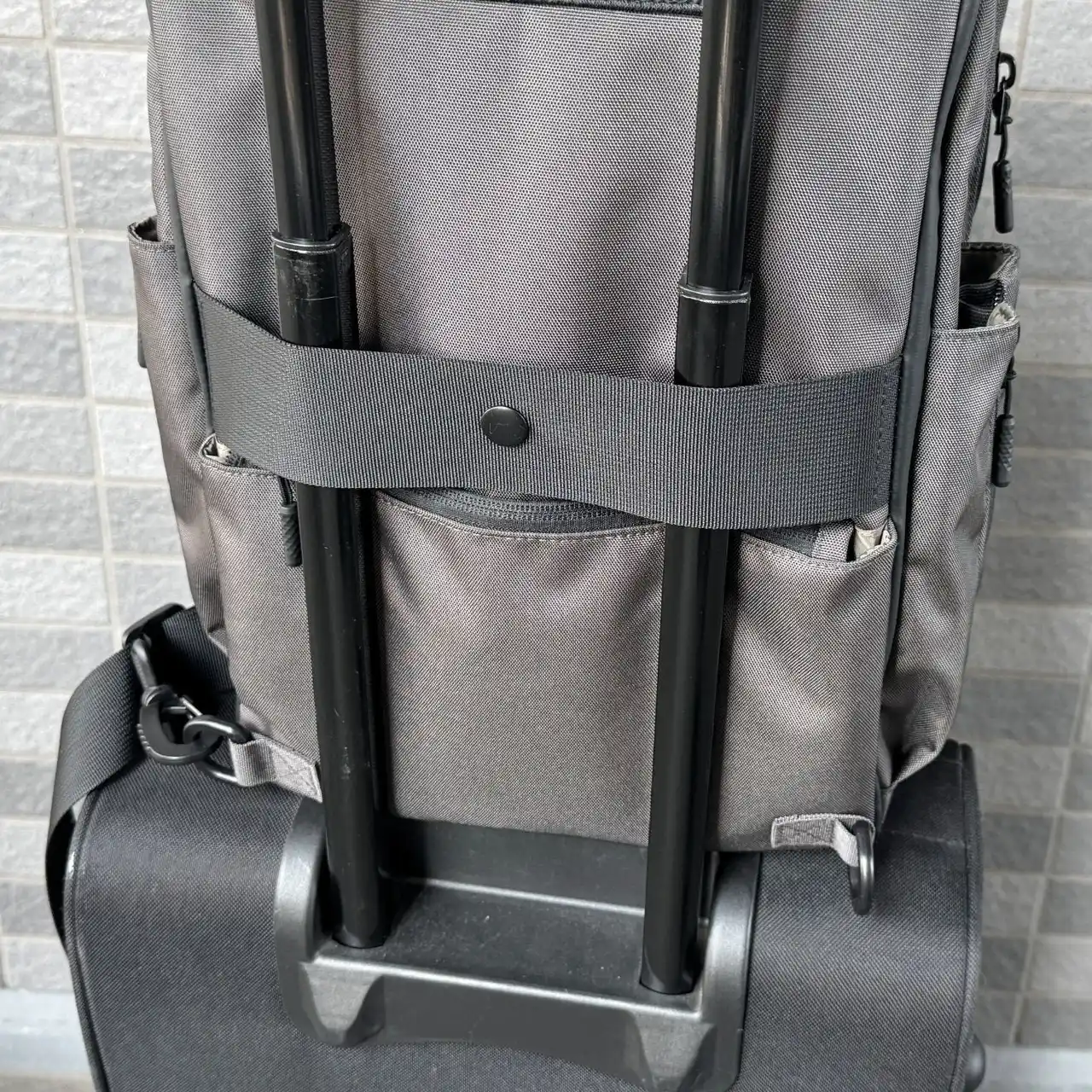 背面にはキャリーバッグに固定できるベルトを装備。 キャリーのハンドルに通すことでバッグを安定して固定でき、移動時の負担を軽減します。 旅行や出張など、長距離移動の際にも便利な機能です。 |