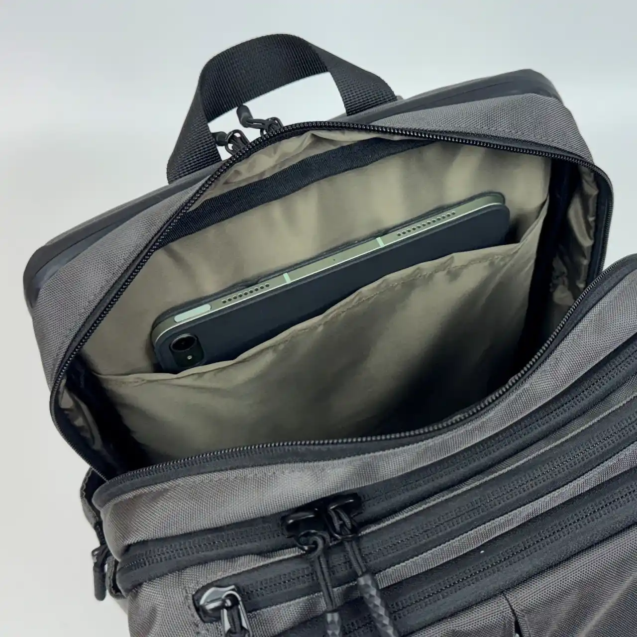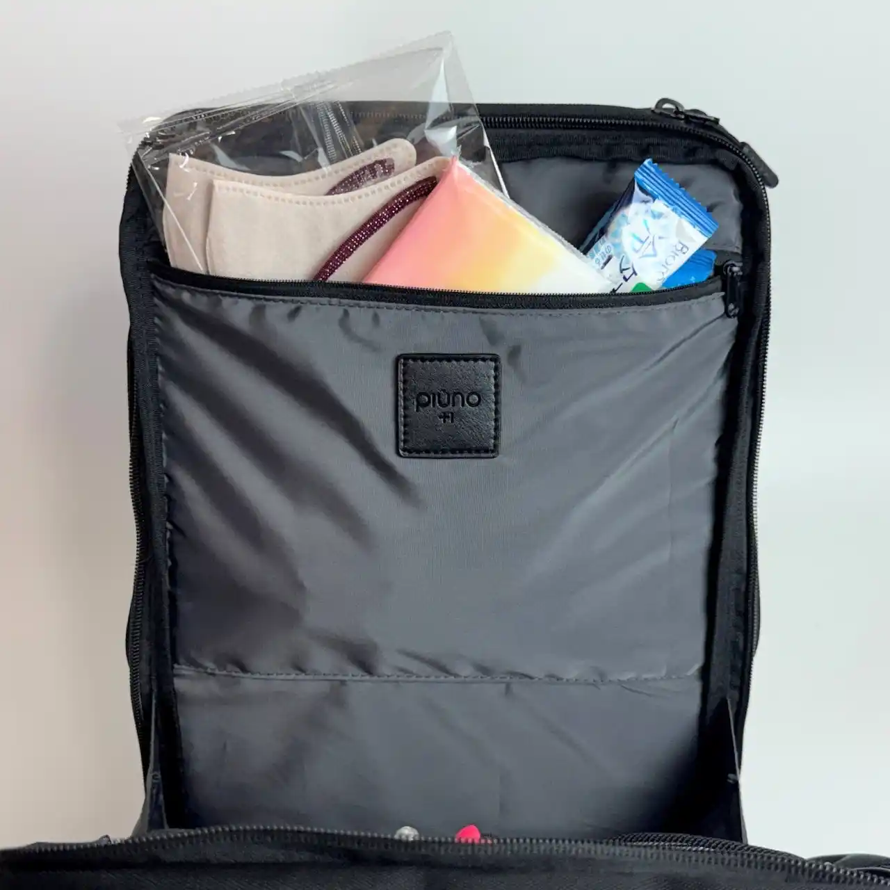 バッグの前から2層目には、バッグ上部と両サイドに クイックファスナーポケットを配置しました。 |