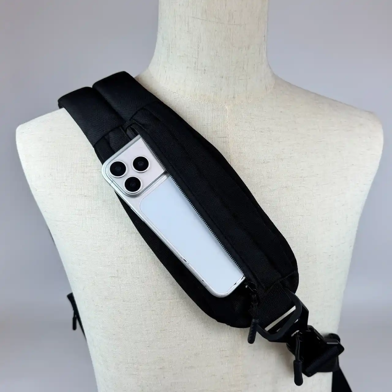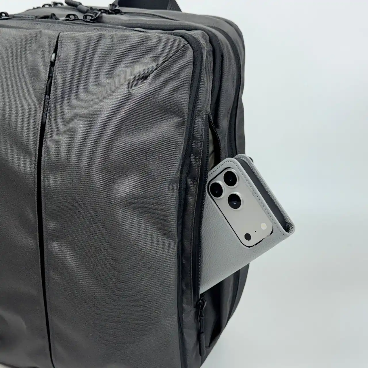 | スマートフォンやイヤホンなど、頻繁に出し入れするアイテムを収納できるため、バッグを前に回さなくてもスムーズに取り出すことができます。 | ||||||