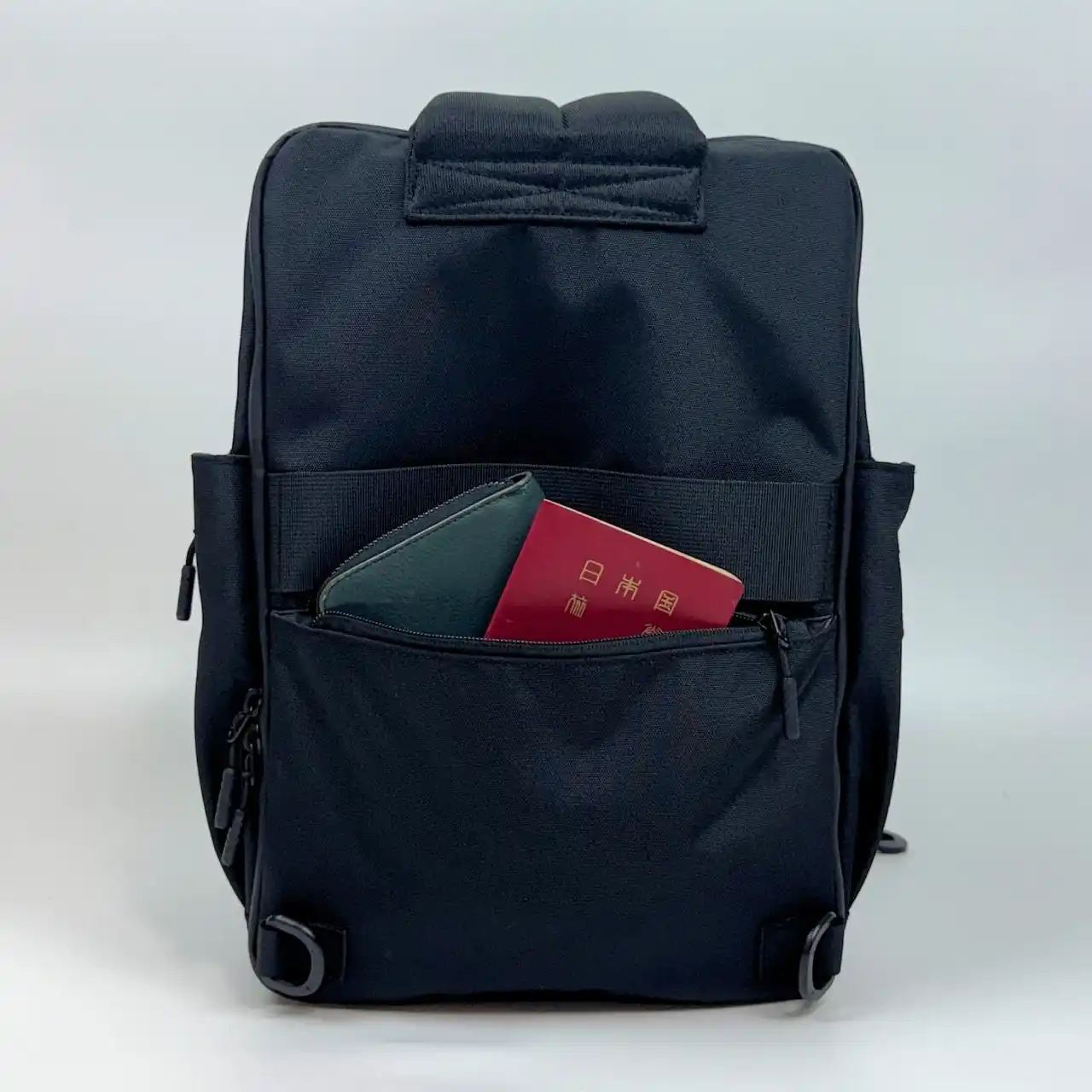 着用時に身体に当たる背面には、ファスナーポケットを配置。 パスポートや財布などの貴重品を収納でき、海外旅行や人混みの多い場所でも安心して持ち歩けます。 |
