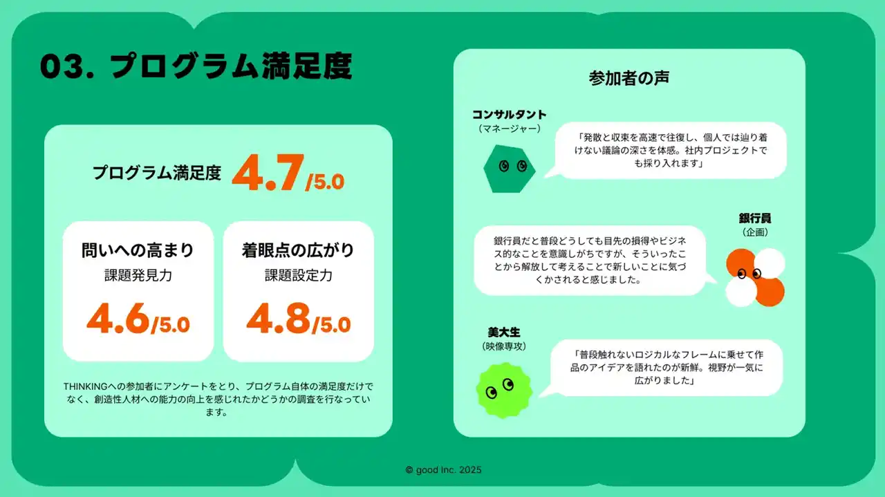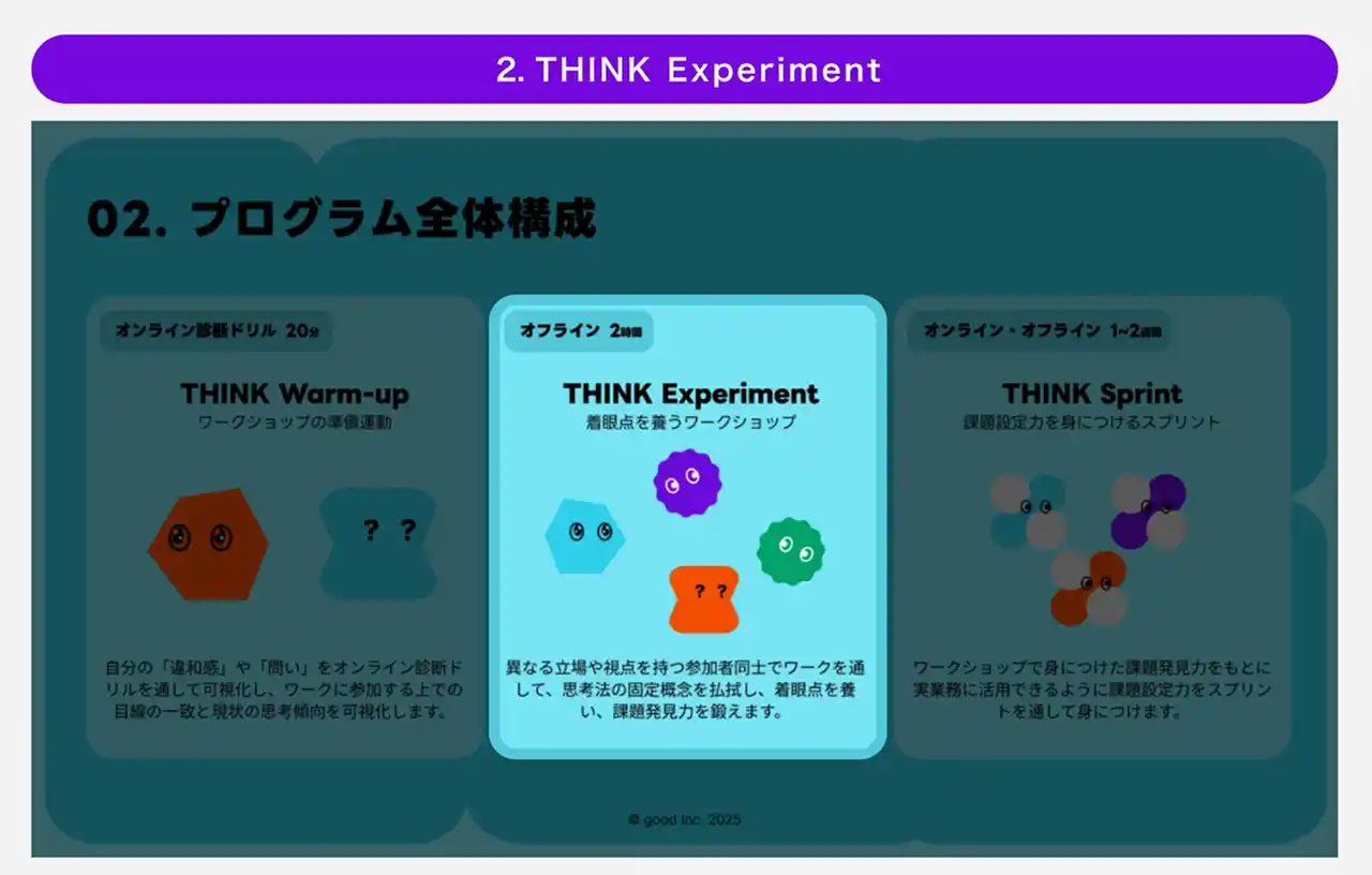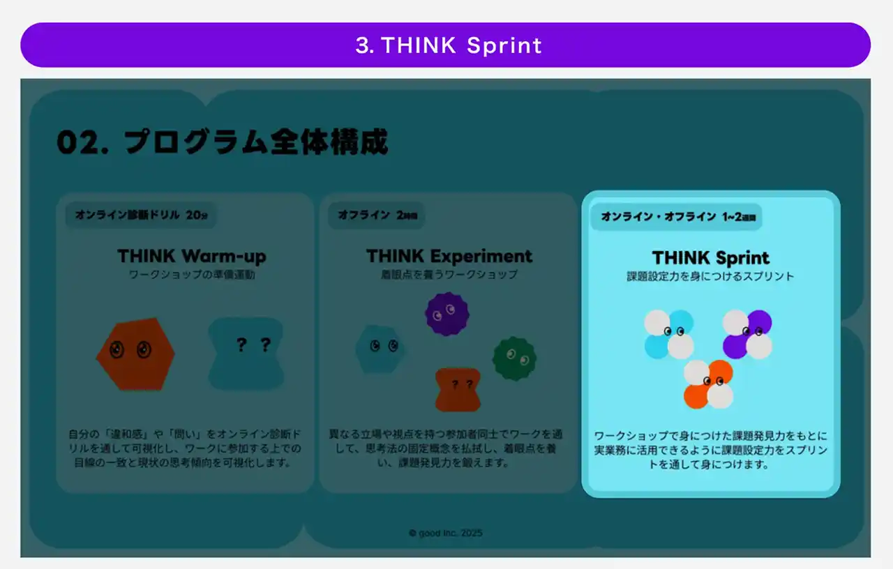 THINKINGは、good Inc.の自社事業(社会実装事業)の一つとして位置づけられており、「着眼点」「問い力」「課題設定力」の3つを中心に、人と組織の"思考の質"そのものを鍛えることを目的としています。 |