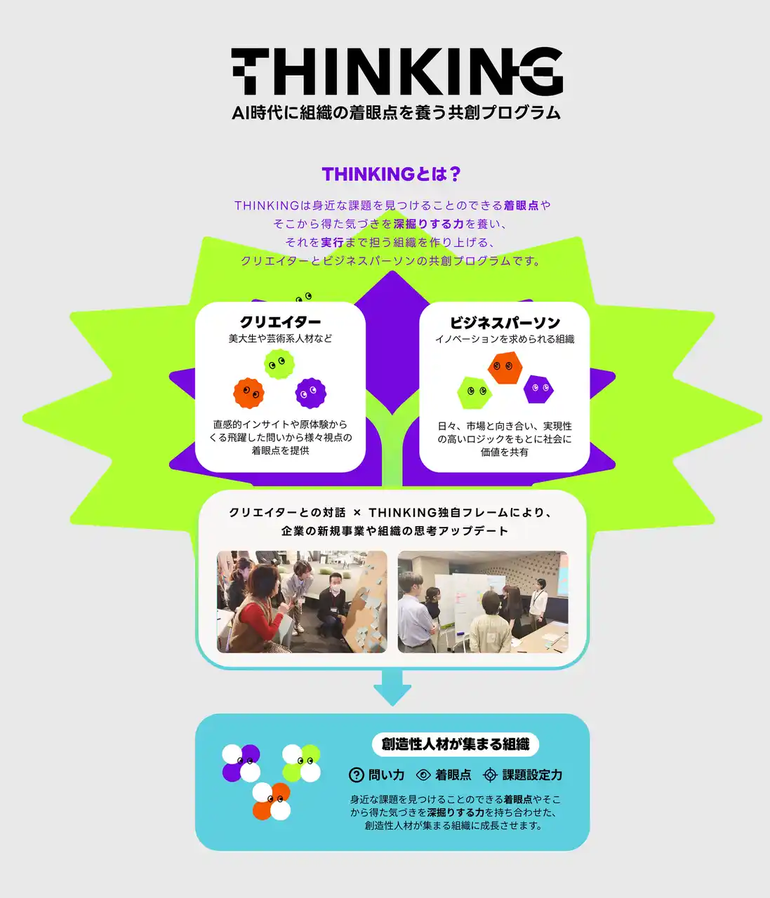 この構造的な課題を解決するために、good Inc.は「ビジネスパーソンとクリエイターの相互理解の場」を提供するプログラム「THINKING」を開発しました。 |