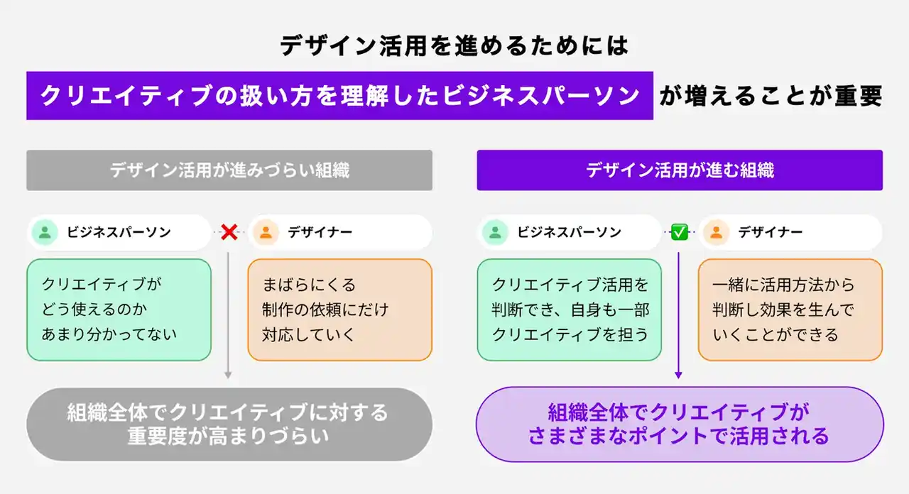 ビジネスパーソン側の課題:クリエイティブが大事とは理解しつつも、実際に活用した経験がないため、自己の経験則やビジネスフレームワークのみで思考してしまう。 クリエイター側の課題:事業的な会話をリードした経験が乏しく、「依頼待ち」の構図から抜け出せず、ビジネスを動かすポジションに立てていない。 |