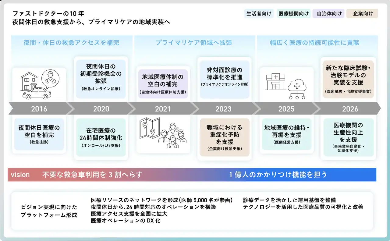 | ファストドクター株式会社は、本日2026年4月1日に創業10周年を迎えます。夜間・休日の救急支援から出発した当社は現在、人口減少や高齢化、医療人材の不足、社会保障費の増大を背景に「プライマリケアの地域実装」を支援する取り組みへと軸足を移しています。テクノロジーと新たな運用モデルを活用しながら、限られた医療資源で必要な医療を届ける仕組みづくりを推進しています。 | |||