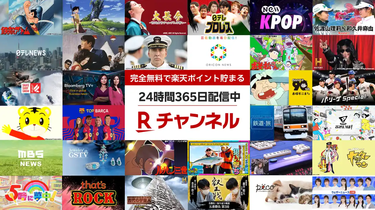 アニメ、映画、ドラマ、ニュース、スポーツ、エンタメ、趣味、キッズなど幅広いジャンルの57チャンネル(2026年4月1日時点)を、テレビ放送と同様に番組表に沿って24時間・365日無料で視聴できる動画配信サービスです。スマートフォンアプリ、ウェブブラウザ、Net-Vision対応テレビ、Android TV(TM)アプリとAmazon Fire TV(TM)アプリにおいて、すべて無料で利用することができます。また、視聴時間に応じて「楽天ポイント」を貯めることが可能で、見逃し配信にも対応しています。広告主向けには、「Rチャンネル」でターゲットユーザーに広告配信ができるサービス「Rチャンネル Ads」も提供しています。 |
