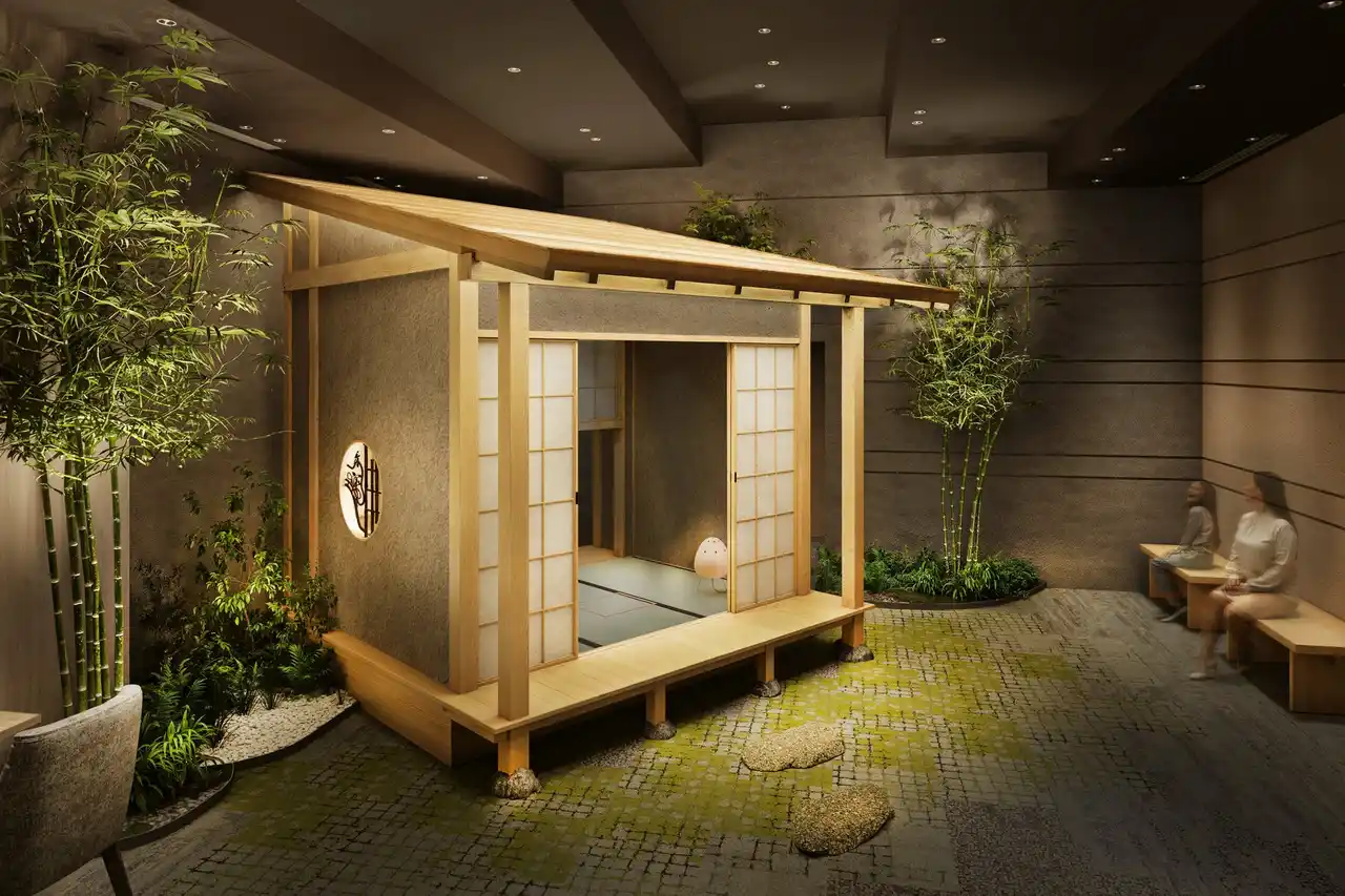 内装のデザインコンセプト「光陰庵」は、光と陰の対比を軸に明るさと静けさを織り交ぜ、曖昧な境界から生まれる調和により、お客さまに安らぎと開放感が同居する時間を提供します。 |