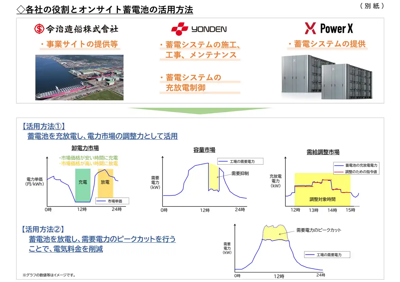 四国電力株式会社(以下、四国電力)および今治造船株式会社(以下、今治造船)は、両社共通の出資先である株式会社パワーエックス(以下、パワーエックス)が製造する定置用蓄電システムを用いた「オンサイト蓄電池事業」を実施するため、今治造船西条工場東ひうち事業部の敷地内への設置工事を進めてまいりましたが(2025年9月1日お知らせ済み)、本日、運用を開始いたしましたのでお知らせいたします。 |