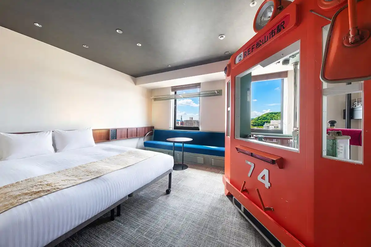 | 伊予鉄「松山市駅」に隣接した最高のロケーション。ホテルのコンセプトは、「THE STATION」で、鉄道をイメージしたコンセプトルーム「伊予鉄ルーム」を設置し、客室の窓からは、路面電車のレールビューが望め、鉄道ファンはもちろん、幅広いお客様に鉄道の旅気分をお楽しみいただけるようなデザインとなっております。また、館内にはサウナ付き大浴場や貸し切りでゆったり利用できる家族風呂を設け、宿泊のお客様はもちろん、日帰り利用でもご利用いただけるよう、くつろぎの空間をご提供。 | ||||||||||||||||