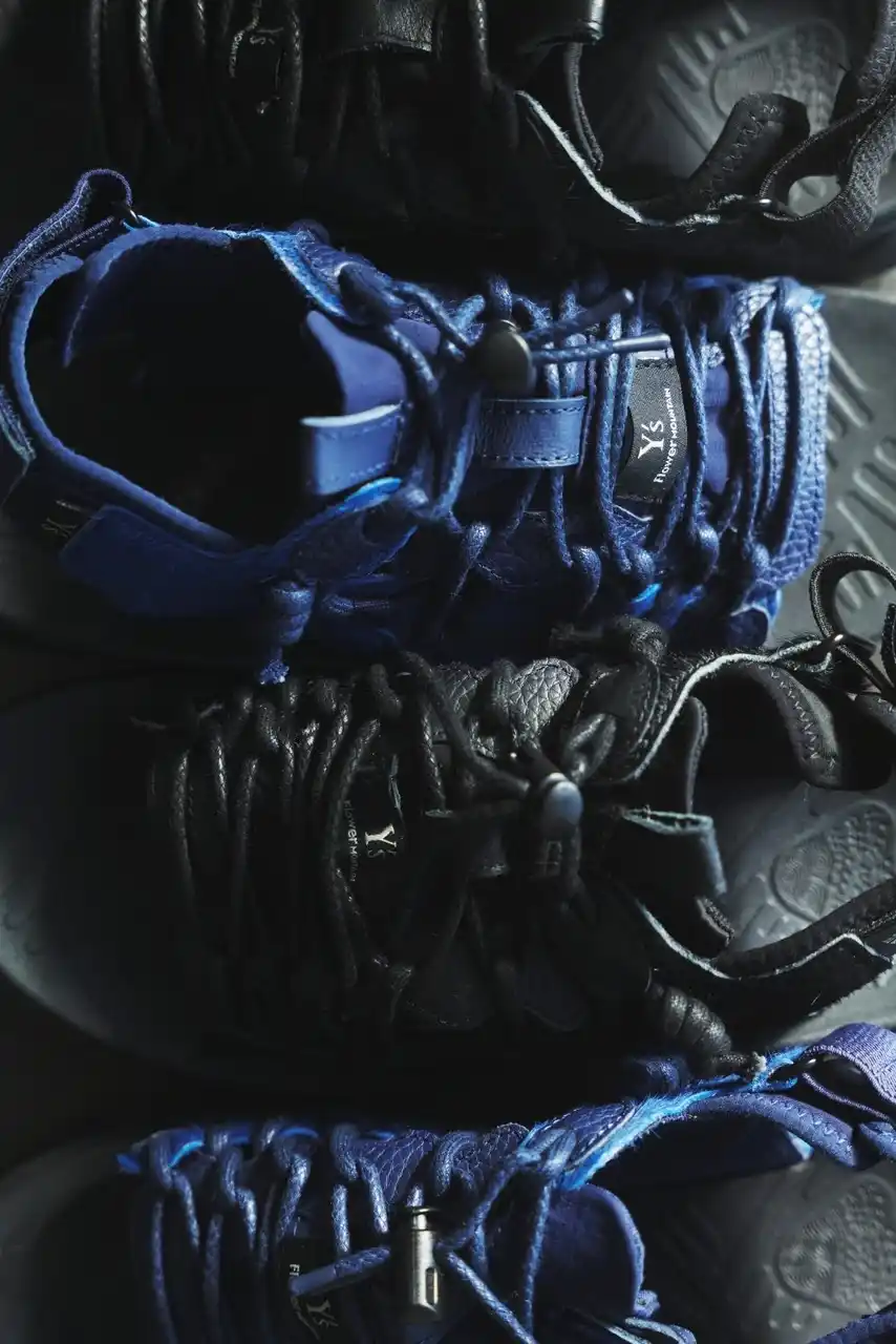 アッパー全体に元々入っていたパンチング穴を省き、紐先や踵のゴムの種類の素材や仕様を変更するなど、細部に洗練された表情を取り込んだ。甲中央には「Y’s」「Flower MOUNTAIN」のダブルネーム、サイドには「Y’s」ロゴの織りネームを配している。 |