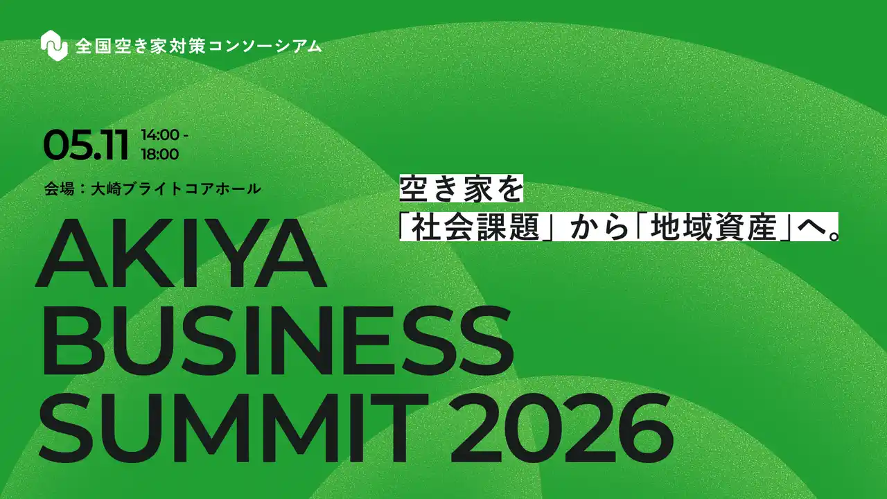 日本の社会課題である空き家の増加抑制に取り組む全国空き家対策コンソーシアム(以下「本コンソーシアム」)は2026年5月11日(月)に「AKIYA BUSINESS SUMMIT 2026」を開催します。「空き家を『社会課題』から『地域資産』へ。」をテーマに、空き家市場の最新動向の情報収集や、空き家を起点とした新たな事業創出の場を提供します。 |