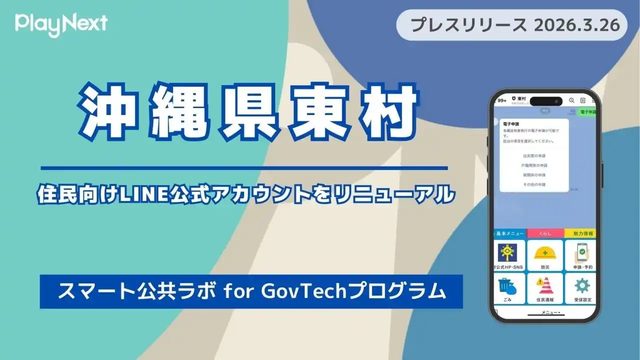 | レイネクストラボ株式会社(本社:東京都品川区、代表取締役:柏 匠、以下 「プレイネクストラボ」)は、沖縄県東村(以下「東村」)のLINE公式アカウントを「スマート公共ラボ for GovTechプログラム」を活用してリニューアルし、2026年3月26日(木)より運用を開始したことをお知らせします。 | ||||||||||||||||||||||||