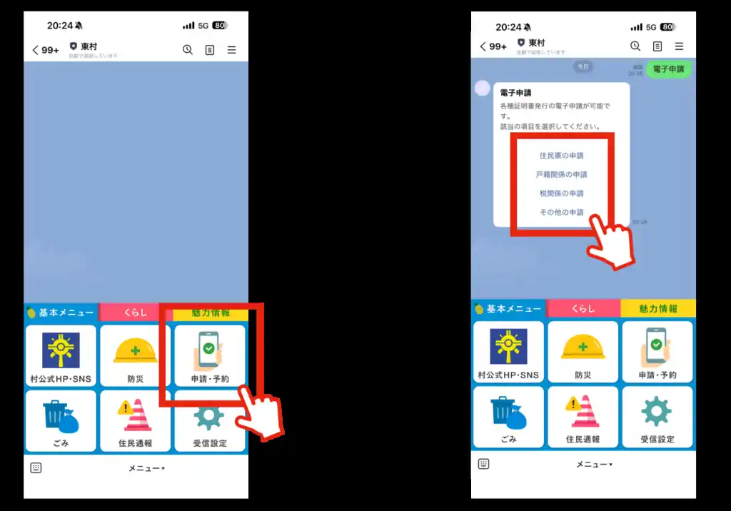 | 各種申請がLINE上で出来るようになる電子申請の機能を導入、行政手続きがオンラインで簡単にできるようになりました。 | ||||||||||||||||||||||||
