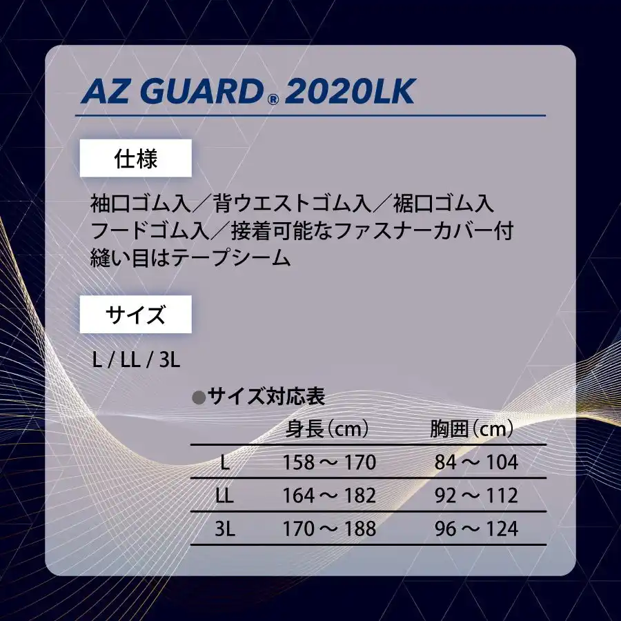 | 「AZ GUARD(R) 2020LK 続服」は、ポリプロピレンメルトブロー不織布をポリプロピレンスパンボンド不織布で挟み込んだSMS不織布を使用しており、これまで当社で取り扱う他のSMS不織布の防護服では適合が困難であったJIS T 8115 タイプ4(スプレー防護用密閉服)にも適合した高い防護性能と、SMS不織布ならではの優れた通気性、透湿性を有した製品です。 | |||||||||||||||