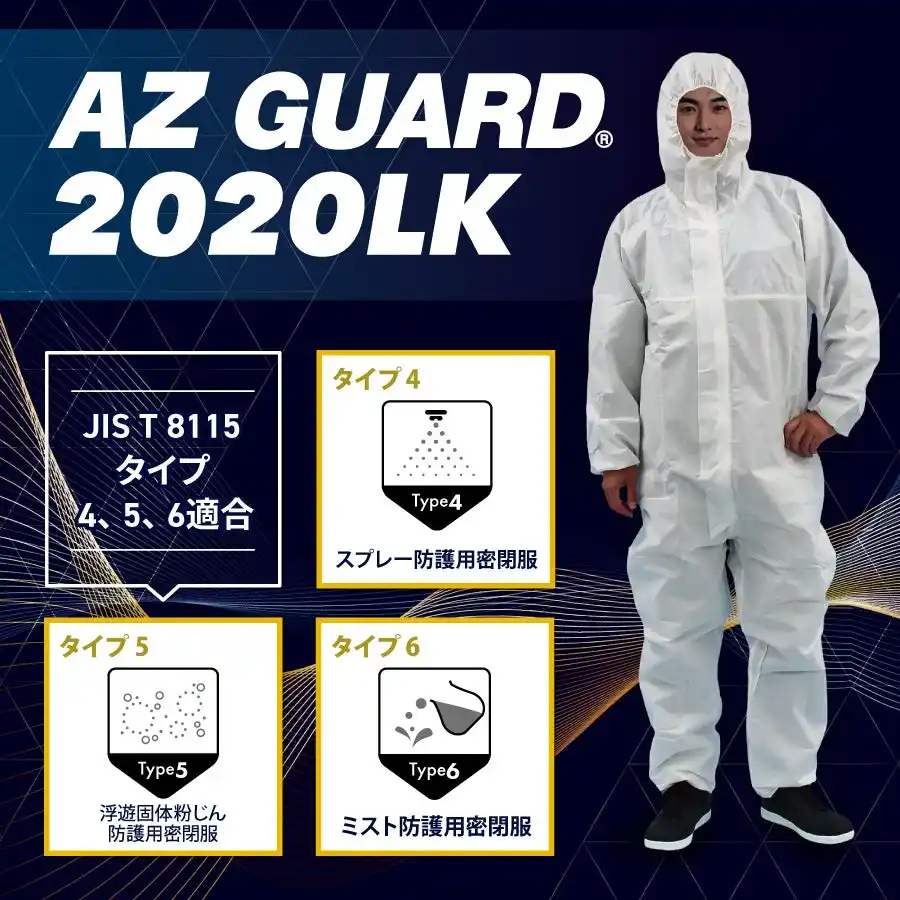 | 防護服の専門サプライヤー、アゼアス株式会社(本社:東京都台東区、代表取締役社長:斉藤 文明)は、化学防護服の日本産業規格であるJIS T 8115における、タイプ4(スプレー防護用密閉服)、 タイプ5(浮遊固体粉じん防護用密閉服)、タイプ6(ミスト防護用密閉服)に適合した製品として、「AZ GUARD(R) 2020LK 続服」を4月1日より販売開始いたしました。 | |||||||||||||||