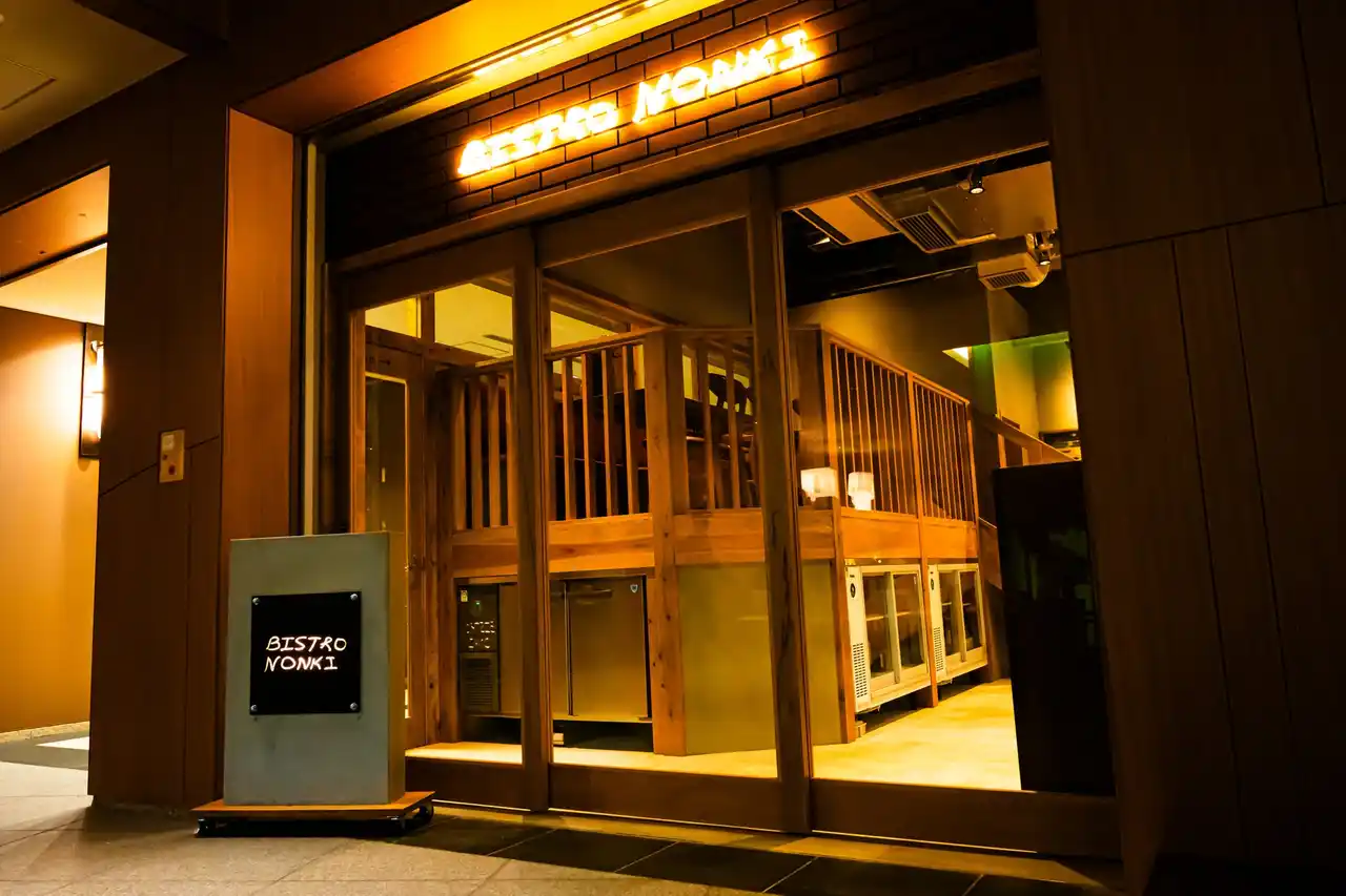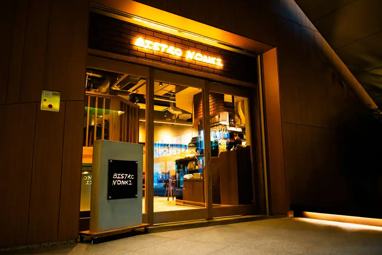 「BISTRO NONKI」のネオンが輝く外観 |