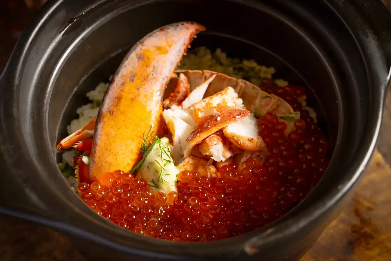 【BISTRO】×【釜炊き米】のんきが手掛けるお米がススムビストロは、肉と野菜の旨味が凝縮したブロード(洋風だし)でご飯を炊きあげます。なかでも名物は「青森県産ニンニクのガーリックライス」。前述したブロードと、隠し味には自家製のガーリックオイルをまぜあわせ高火力で釜炊き丸ごとローストした青森ニンニクを仕上げにのせれば完成釜蓋をあけた瞬間ひろがる湯気にのった香りは食欲をくすぐること間違い無しです。季節毎の旬の食材を使用した炊き込みご飯もご用意しており、見た目も楽しく食べ応えのある逸品となっています。 |