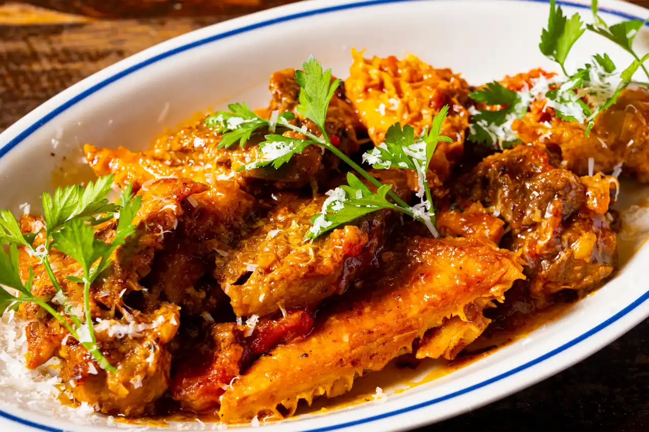 ホロホロになるまで柔らかく煮込んだハチノスと、おおぶりにカットした牛スジを2種のトマトソースで更に長時間じっくり味をいれながら追い煮込み。手間ひまかけて作るこのトリッパは、「BISTRO NONKI」でしか味わえないまさにスペシャリテ。その他にも多数の煮込み料理をご用意しています。 |