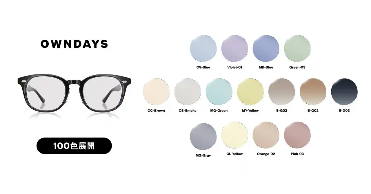 | OWNDAYSでは今回、新たにCC-Brown、MY-Yellow、MG-Green、CS-Smoke、S-G02、B-G02、S-G03の7色を追加し、カラーレンズのラインアップを拡充しました。視界を快適にサポートする機能的なカラーから、コーディネートのアクセントとなるカラーまで幅広く取り揃え、ライフスタイルやファッションに応じた選択が可能です。 | |||||||||||||