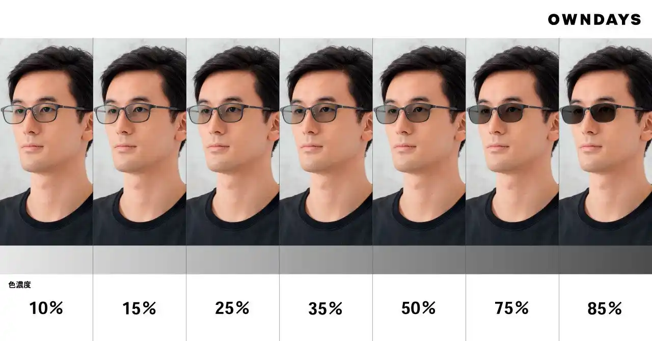 | OWNDAYSでは、カラーレンズの色だけでなく濃度でも選ぶことができます。レンズの濃度は「可視光線透過率」に関係しており、色味の濃度が高いほど光の透過を抑えることができます。カラーと濃度の組み合わせにより、シーンに適した“見え方”を選ぶことが可能です。OWNDAYSは、ご利用シーンに合わせた色の濃さの提案も可能ですので、日常にフィットするアイウェアの選び方をぜひスタッフにご相談ください。 | |||||||||||||