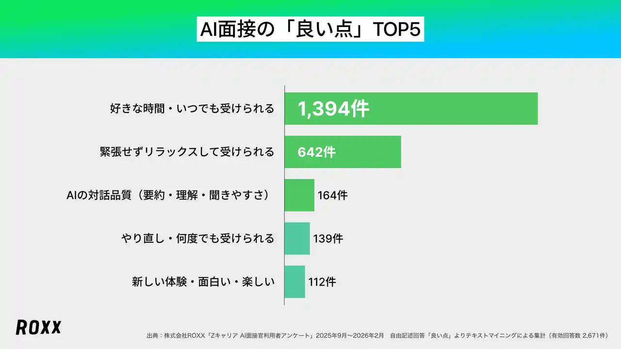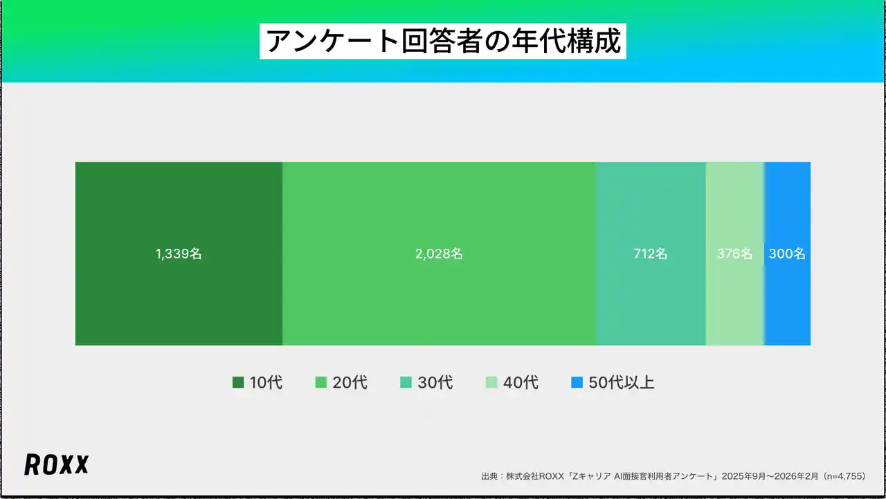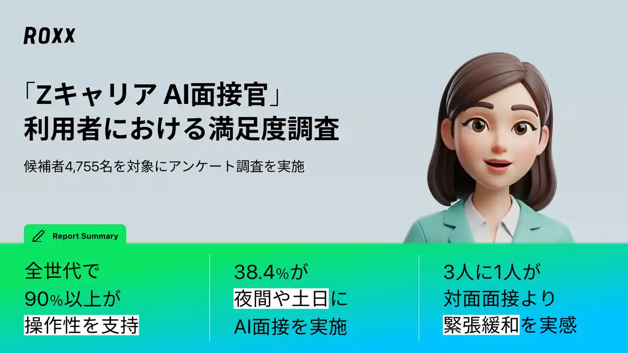 日本全体の所得向上の実現を目指し、労働市場の需給ミスマッチをテクノロジーで解決する株式会社ROXX(本社:東京都新宿区、代表取締役社長:中嶋汰朗、東証グロース:241A、以下 ROXX)は、自社が開発・提供する採用支援サービス『Zキャリア AI面接官』を利用して選考を受けた候補者4,755名を対象にアンケート調査を実施し、「AI面接の利用満足度に関する実態」を分析しましたので、その結果を報告いたします。 |