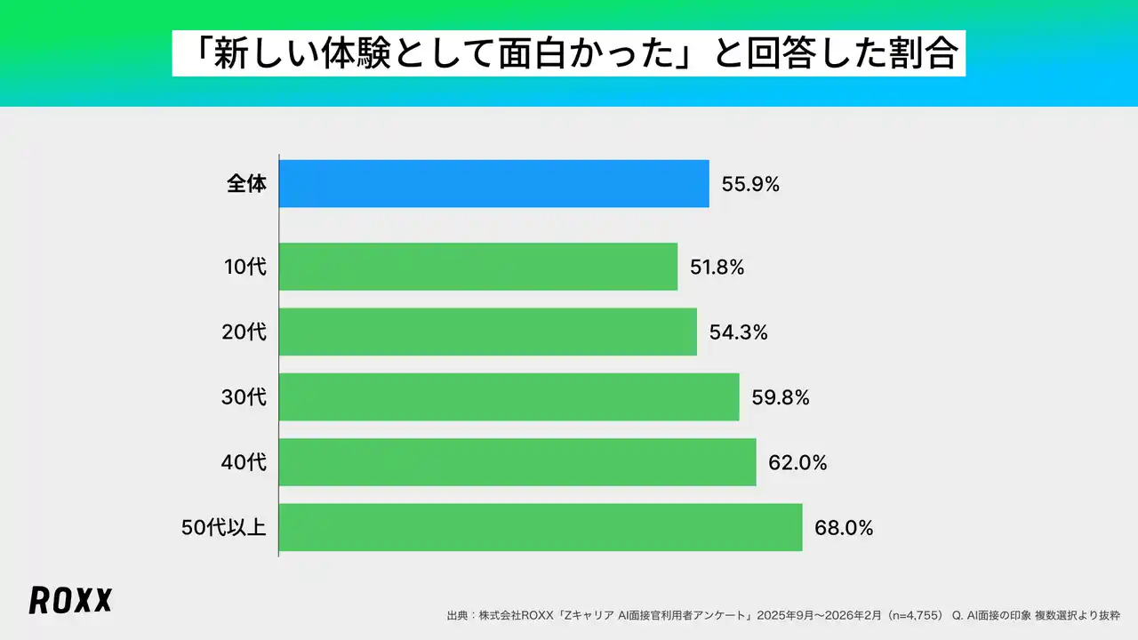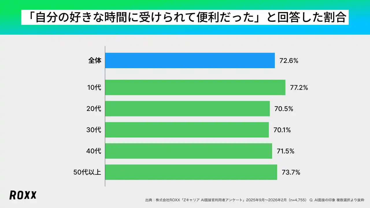 これらの結果から、AI面接は特定の世代に偏ることなく、各年代の生活スタイルやニーズに応じた多面的な価値を提供していることが示されました。 |