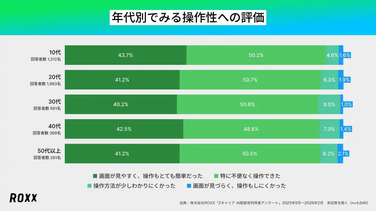 全世代で90%以上が操作性を支持。直感的なUIにより公平な選考機会を実現 10代から60代以上の全年齢層において、90%以上が操作性を肯定的に評価しました。デバイスやIT習熟度に依存しない直感的なユーザーインターフェース(UI)により、属性を問わない公正な選考機会が提供されていることが裏付けられました。 |
