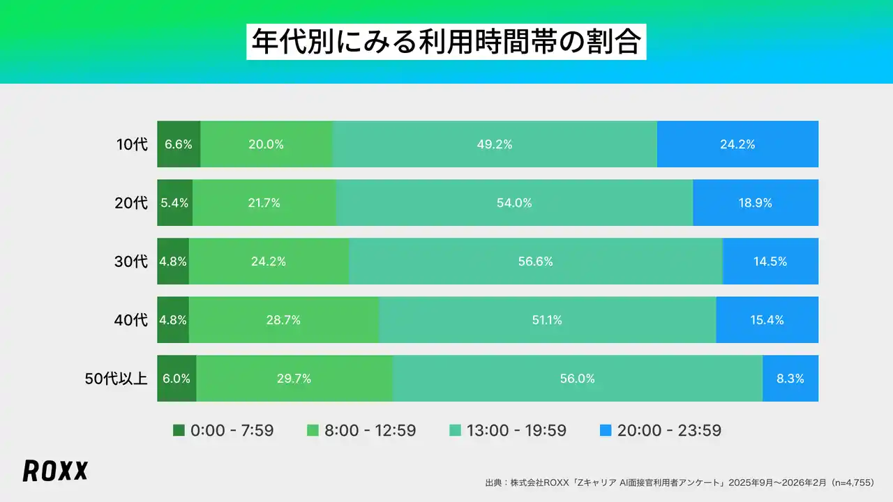 年代別の傾向では、10代において夜間・早朝(20時~翌8時)の利用が30.8%と全体平均を大きく上回りました。一方、年齢層が上がるにつれて午前中の利用率が高まる傾向も見受けられ、AI面接が各世代の生活リズムに合わせて柔軟に利用されていることがうかがえます。 |
