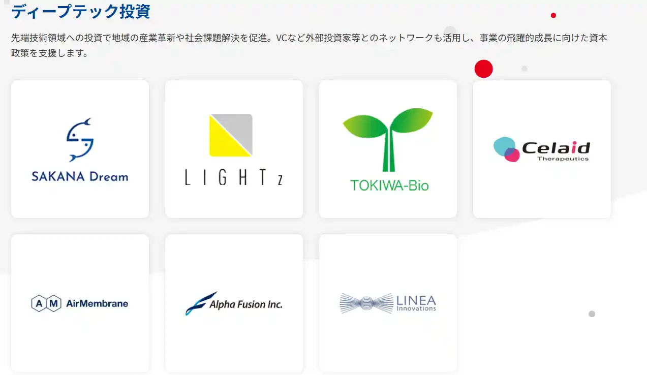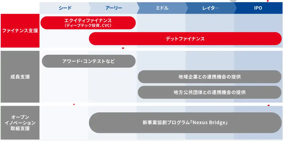 事業拡大の段階に応じた戦略的な資金支援を実施しています。 ・ディープテック分野への投資 ・デットファイナンス ・コーポレートベンチャーキャピタル(CVC)を通じた出資 支援パートナーとの連携もあわせて紹介しています※2。 |