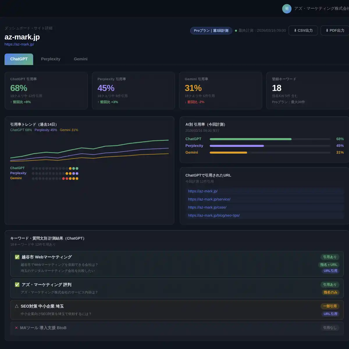 アズ・マーケティング株式会社(代表取締役:菊地 真人、埼玉県越谷市)は、ChatGPT・Perplexity・GeminiなどのAIがWebサイトを引用状況を自動計測・可視化するSaaS「AIMention(エーアイメンション)」を本日2026年4月1日に正式リリースしました。 |