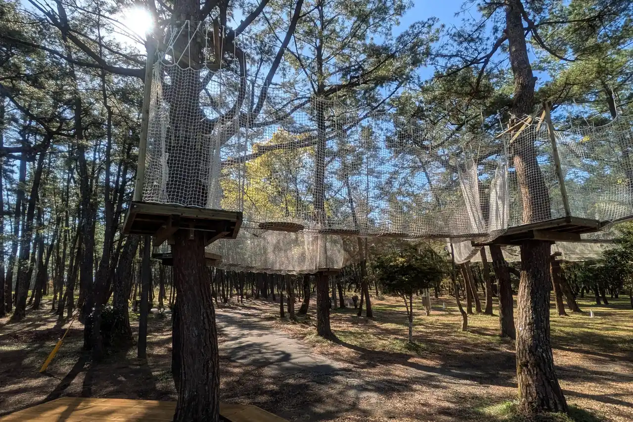 フォレストアドベンチャー・吹上浜は、鹿児島県日置市の海岸沿いに広がる自然の中に位置し、開放感あふれるロケーションが魅力です。コースは、日置市の市木であるクロマツの独特な形状を活かした、非常にユニークな設計となっています。敷地内ではバーベキューも楽しめます。 |