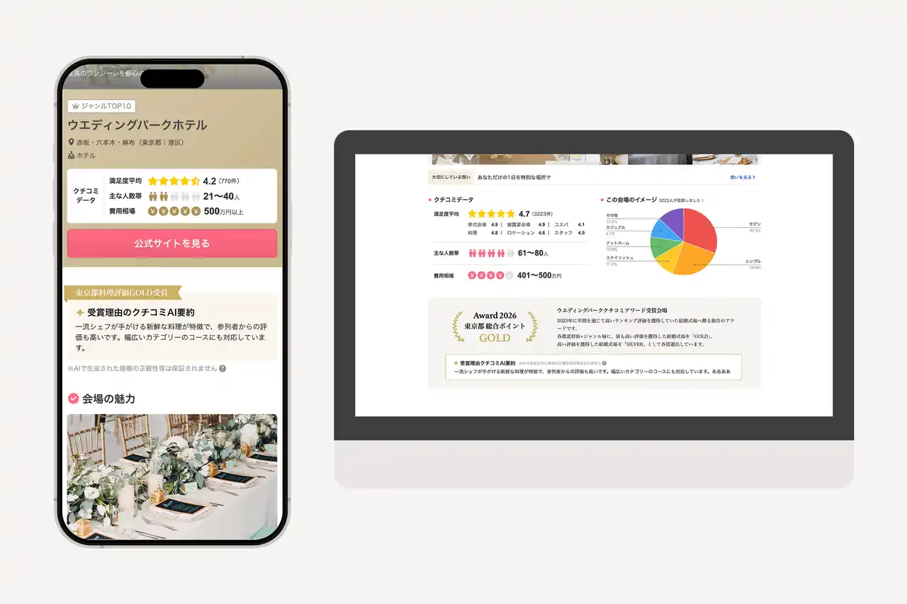 ▼ジャンル詳細 「クチコミ評価」軸(計7ジャンル) 総合ポイント/料理評価/コストパフォーマンス評価/挙式会場の雰囲気/披露宴会場の雰囲気/スタッフ評価/ロケーション評価 「会場タイプ」軸(計6ジャンル) ホテル/ゲストハウス/チャペル・教会/レストラン・料亭/神社・寺院/専門式場 「Wedding Park Kuchikomi Award2026」は、2025年1月~12月の計24回のクチコミランキング結果をもとに算出しており、Wedding Parkサイトに掲載のある会場のうち、受賞率はGOLDが3.9%、SILVERが6.4%となりました。受賞会場など詳細は、下記ページをご覧ください。 ▼Wedding Park Kuchikomi Award2026スペシャルページ https://www.weddingpark.net/ranking/award/2026 今後も継続的に「Wedding Park Kuchikomi Award」を発表することで、ウエディング業界の活性化、Wedding Parkサイトのコンセプトである「自分に合う結婚式の見つけ方。」をサポートし、より多くのカップルが自分たちらしい結婚式場を見つけられるサイトを目指してまいります。 また、4月末にはWedding Parkに掲載されている一部の会場詳細ページに、Awardの受賞理由となるクチコミを生成AIで要約し表示する機能をリリース予定です。今後も、最新の技術を使用した機能改善やアップデートを定期的におこなってまいります。 |