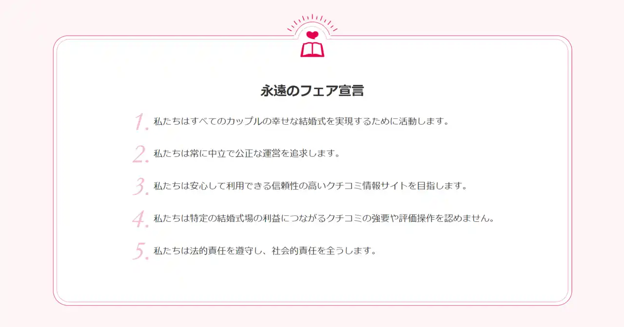 ウエディングパークでは、すべてのカップルが幸せな結婚式を実現できるよう、ユーザーにとって世界で一番信頼できる存在になることを目指しています。 そのために、「永遠のフェア宣言」を掲げており、実現に向けてクチコミの投稿のガイドラインや、違反チェック・不正監視などを行う専門チーム、クチコミ投稿の本人確認など様々な取り組みを行っております。 詳細はこちら:サイトの運営方針 https://www.weddingpark.net/site/policy.html |