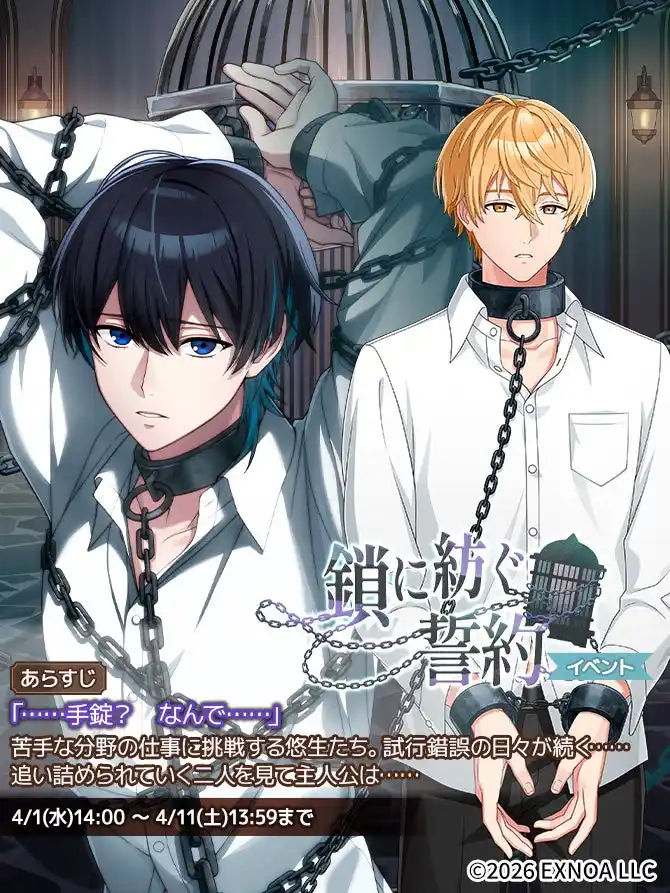 期間限定で、「SSR【鎖に紡ぐ誓約】悠生」と「SR【鎖に紡ぐ誓約】ヨウ」が初登場するガチャを開催いたします。 |