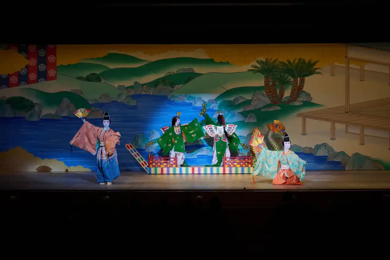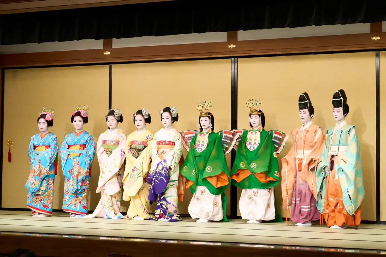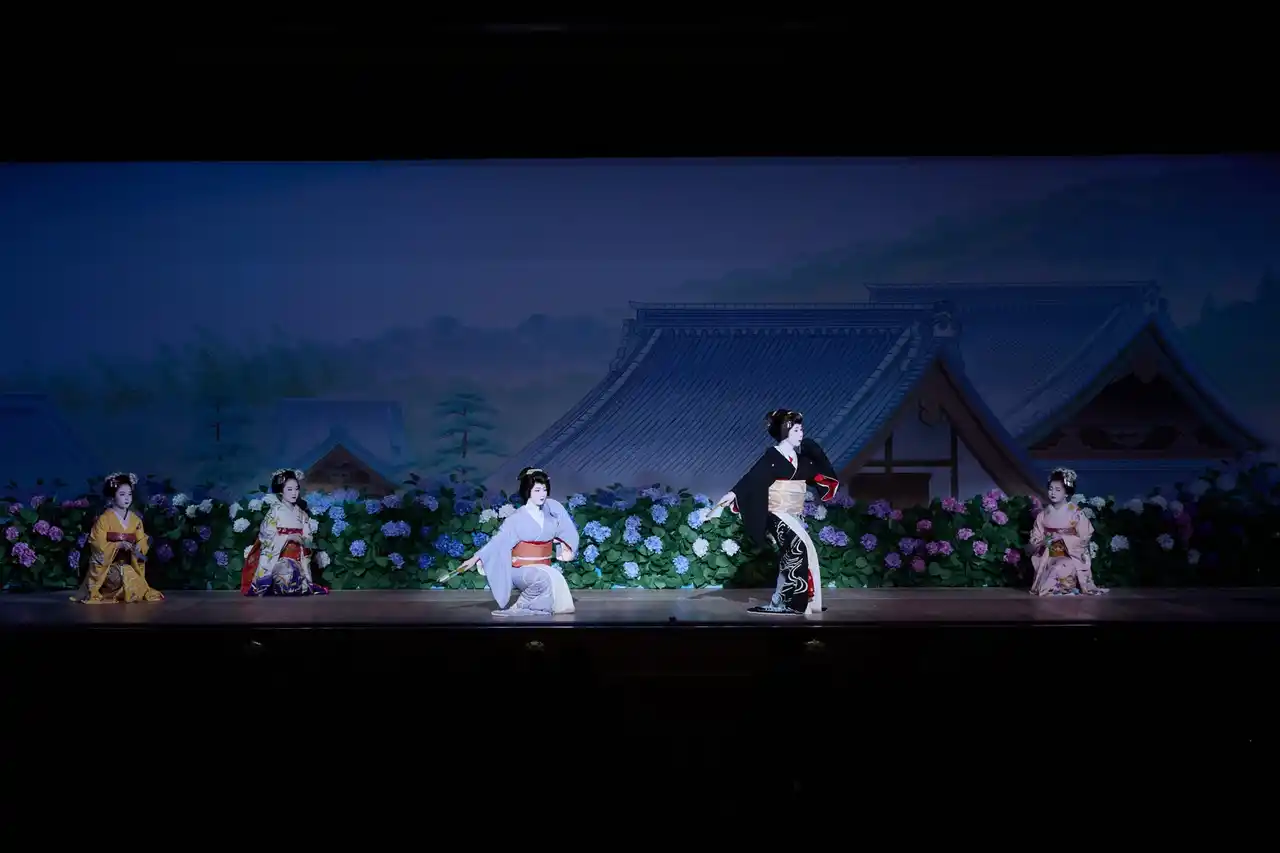 | 第二景「月ヶ瀬梅林逍遥(つきがせばいりんそぞろあるき)」は本年の恵方・南南東を念頭におき、月ヶ瀬の早春を背景とします。第三景「後水尾天皇饗応絵巻(ごみのおてんのうきょうおうえまき)」は、徳川秀忠と家光が二条城で後水尾天皇をもてなした饗応の一コマ、第四景「楊谷寺紫陽花花手水(ようこくじあじさいはなちょうず)」は柳谷観音楊谷寺の紫陽花を愛でる芸妓・舞妓の場です。 第五景「土蜘蛛頼光館(つちぐもらいこうやかた)」では、能「土蜘蛛」をもとにした頼光と土蜘蛛の精の闘いを祇園町らしく二人の女性の妖怪として義太夫で表現します。第六景「修学院紅葉折枝(しゅうがくいんもみじのおりえだ)」は、修学院離宮を背景とする紅葉の場、第七景「雪神泉苑龍神水(ゆきのしんせんえんりゅうじんのみず)」は神泉苑と八坂神社の水のつながりに思いを馳せつつ、善女龍王(ぜんにょりゅうおう)の力で恋が叶うめでたい場としました。第八景「二条城桜吹雪」では、二条城の桜を背景に、出演者全員が登場し華やかなフィナーレを飾ります。 | |||||||||