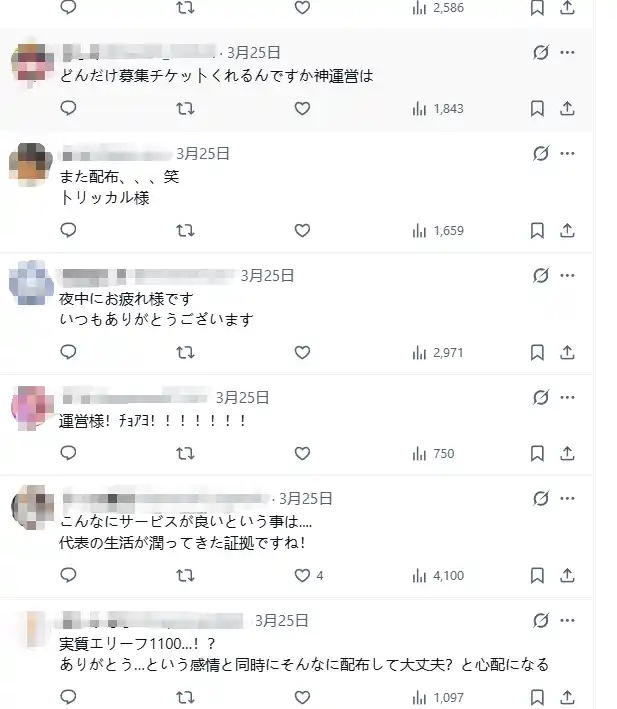 | 例えば、今回の5時間に及ぶ記念PVは、その典型的な例と言えるでしょう。これは単なるプロモーション映像ではなく、チームから教主の皆様への感謝の手紙のようなものです。また、ハーフアニバーサリーに合わせて、コミュニティで二次創作イベントも開催しました。動画配信で『トリッカル』を宣伝したり、ペンを執ってイラストを描いたりと、様々な形でご参加いただけます。その中から優秀なクリエイター様を選出し、感謝の気持ちとして「24金のスピキコイン」を贈呈しました。これは、日頃から自発的に『トリッカル』の魅力を広めてくださっているクリエイターの皆様への感謝のしるしです。もちろん、将来的には、すべてのクリエイターの皆様に感謝を伝えられるような機会を設けたいと考えています。 | |||