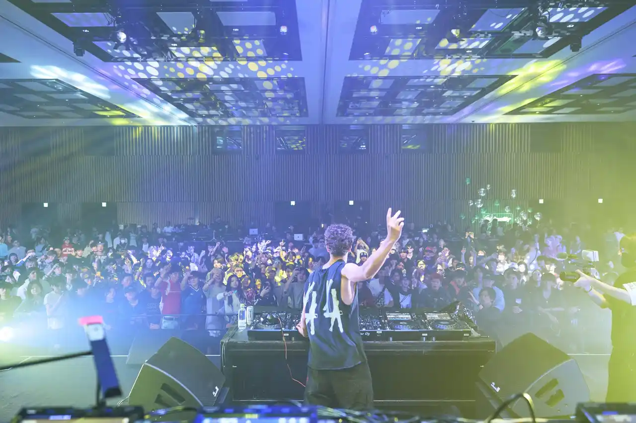 そしてフェスは終盤へ。トップアーティストの公式リミックスも手掛けるウクライナのTim Bliss(15歳)が高度なEDMサウンドでフロアを支配し、大トリであるイビサ島拠点のDJ ELFIGO(14歳)へとつなぎます。4デッキを自在に操る神童の卓越したプレイにより、会場の熱狂はついに最高潮に達しました。 |