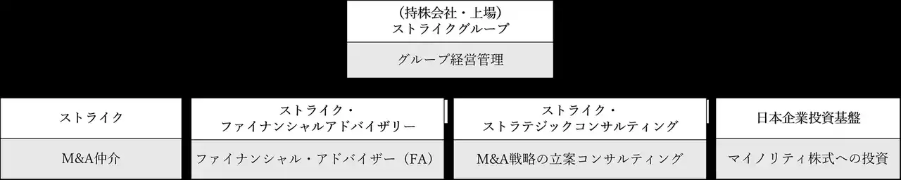 今後は、グループ全体の経営戦略、M&A戦略、ガバナンス強化を担う「株式会社ストライクグループ」を中心に、M&A仲介、ファイナンシャルアドバイザー(FA)、M&A戦略コンサルティングの各機能を分社化・最適化することで、M&Aのあらゆる過程を支援する「総合コンサルティング企業」としての価値提供を加速させてまいります。 なお、持株会社体制移行後の上場会社は、持株会社である当社(「株式会社ストライクグループ」(証券コード:6196))となります。 |