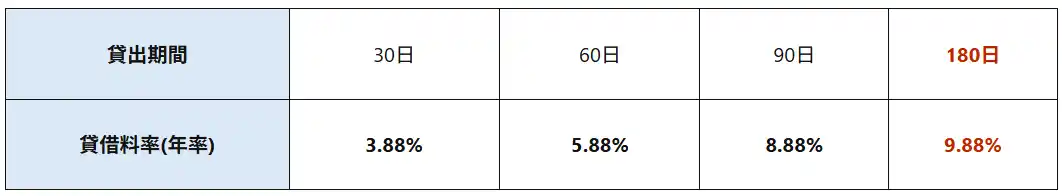 ※貸借料率は、年次(365 日)換算した場合の貸出数量(元本)に対する割合で表示されます。 ※貸出期間満了前に解約すると、貸借料は支払われません。 ※貸出終了後、貸出条件に定められた返還日までに入出金口座に元本の返還と貸借料をお支払いいたします。 「貸暗号資産」の申請はこちら